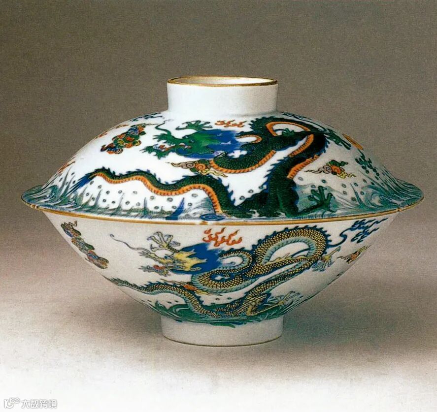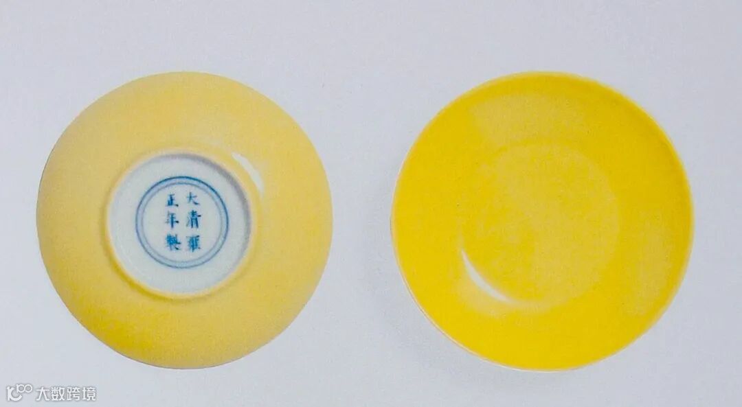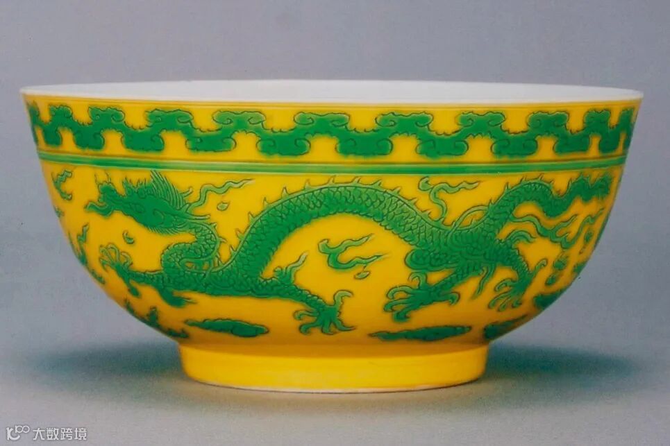 左:北京故宫博物院藏 清雍正 柠檬黄地锥拱绿彩云龙纹墩式碗