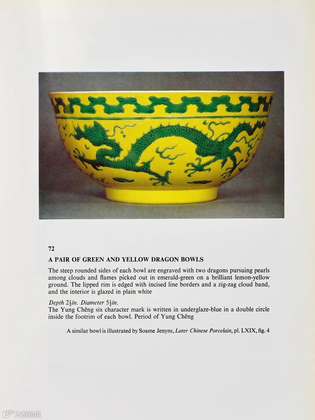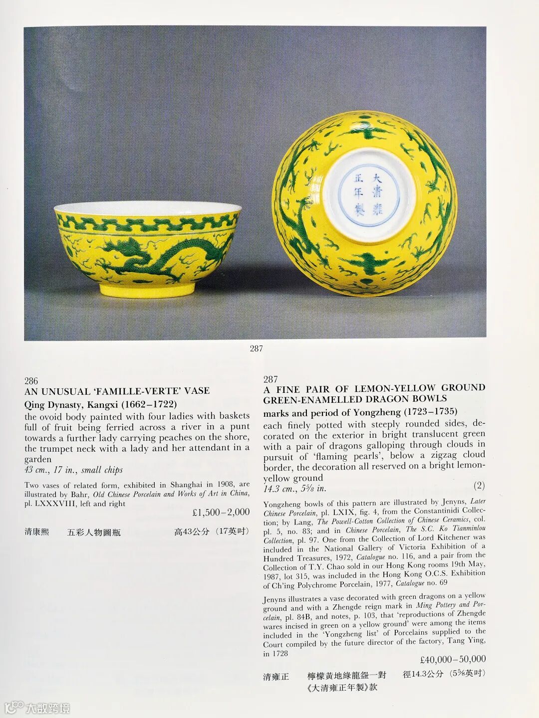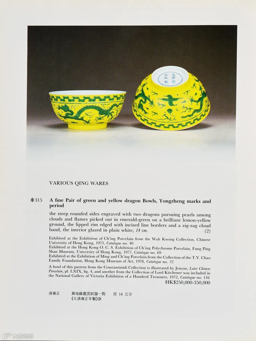 记录:香港苏富比,1987年5月19日,编号315,清雍正 黄地绿龙云纹碗一对