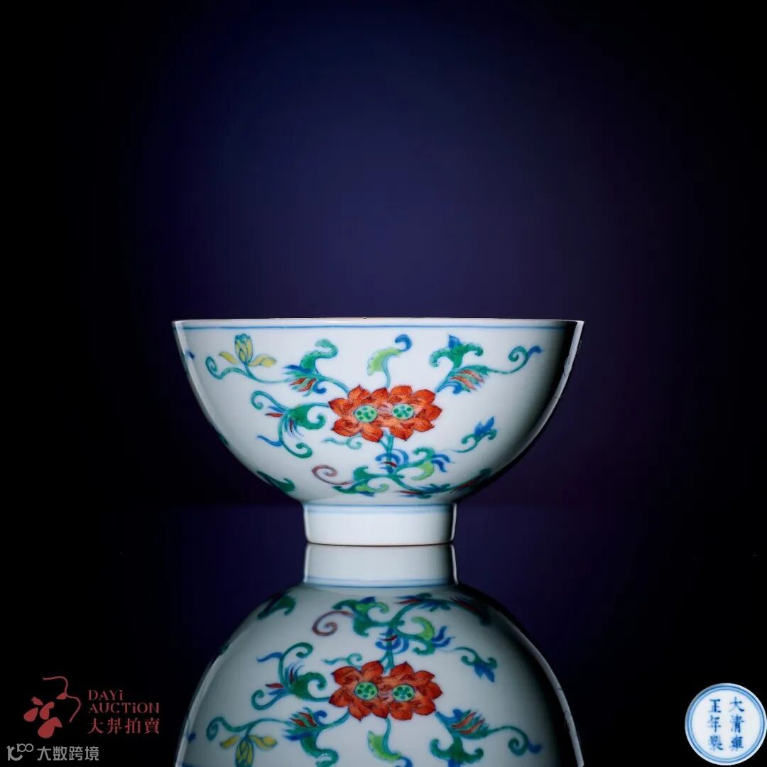 LOT116 清雍正斗彩并蒂莲纹碗造型小巧精致,胎质细腻润白,剔透无瑕,外壁以斗彩工艺装饰三组并蒂莲花,碗内底绘一把莲,整器设色清雅,填彩准确。此式斗彩并蒂莲纹碗为清代官窑经典品种,始烧于雍正时期,历朝均有烧造。
