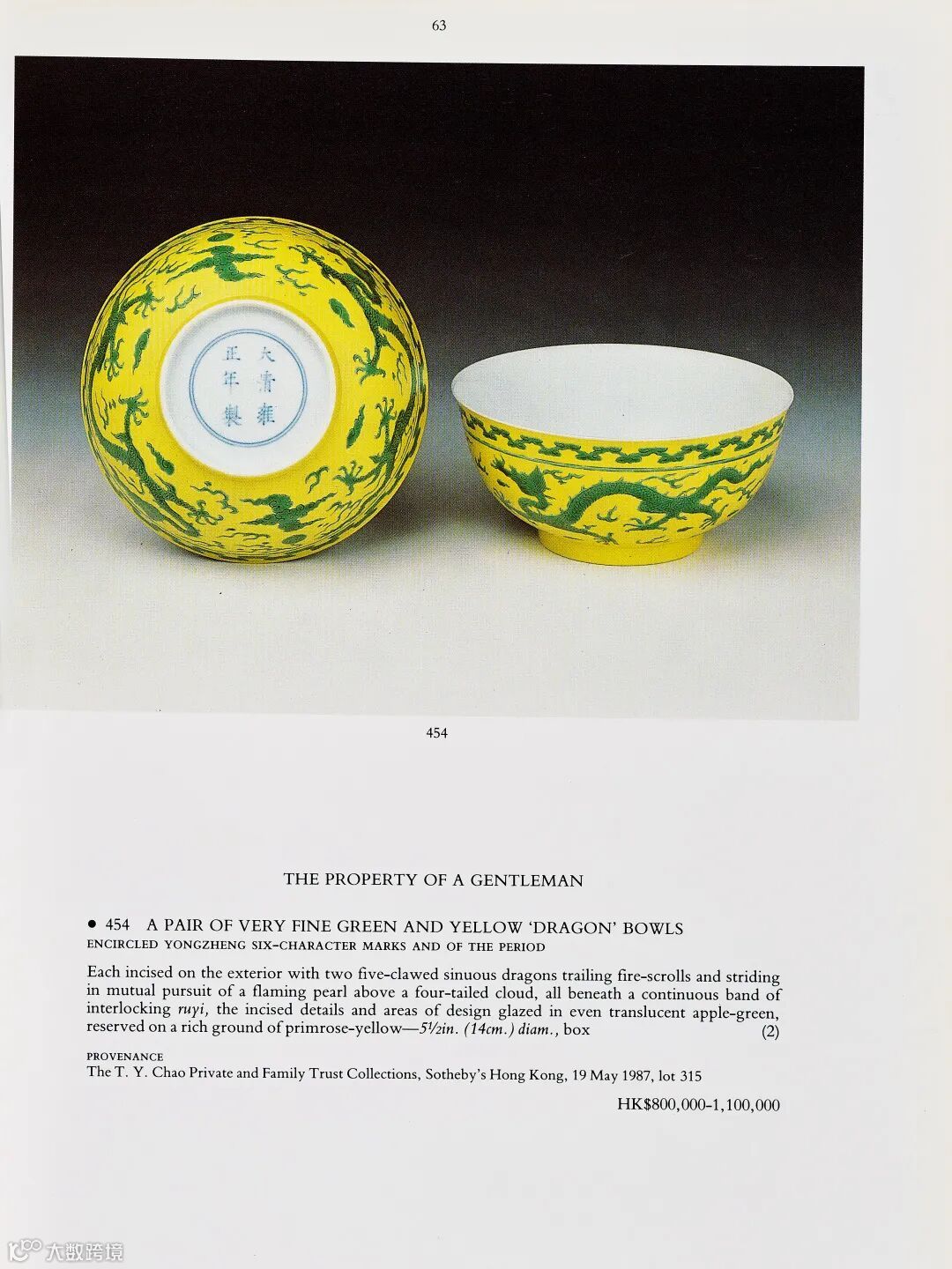 记录:香港佳士得,1990 年10月8日,编号454,清雍正 黄地绿龙云纹碗一对