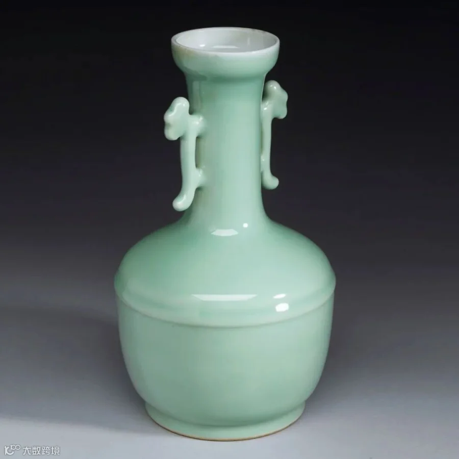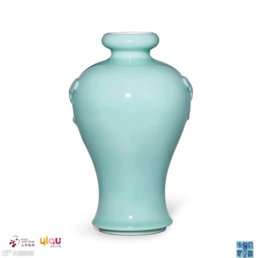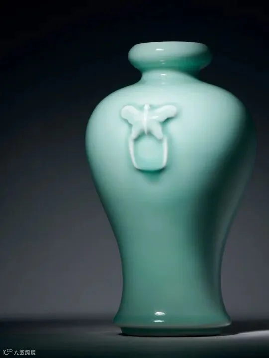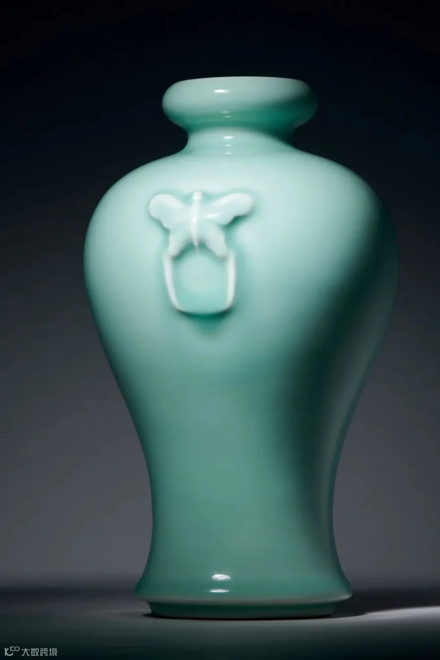 LOT845清雍正 粉青釉蝴蝶耳梅瓶,粉青釉色泽青绿淡雅,釉面光泽柔和,釉层可施得较厚,使器物的釉色达到柔和淡雅的玉质感,为青釉中最佳色调之一。清代景德镇继承龙泉青瓷的优良传统,烧出了深浅不一的各类粉青釉瓷器,对于釉色的烧造,雍正皇帝要求甚高,据《清宫内务府造办处档案》雍正四年六月十一日有载:“……此瓶釉水虽好,称不得上好,尔传与年希尧再烧造时比此釉水要做精细些。”因此达到了呈色均匀、素雅匀净,充分展现实得文人雅致淡然之趣。