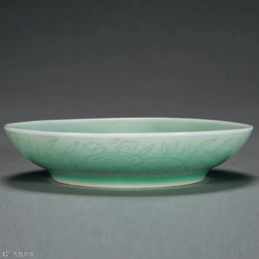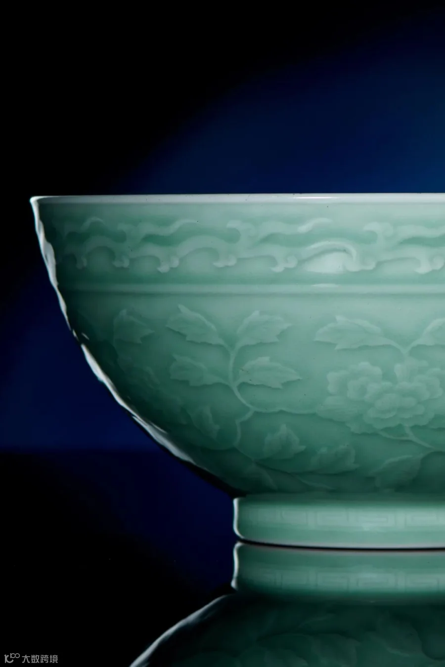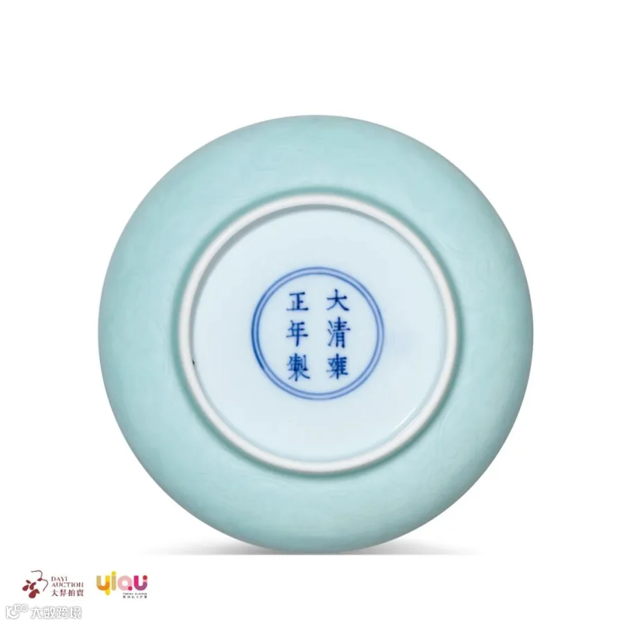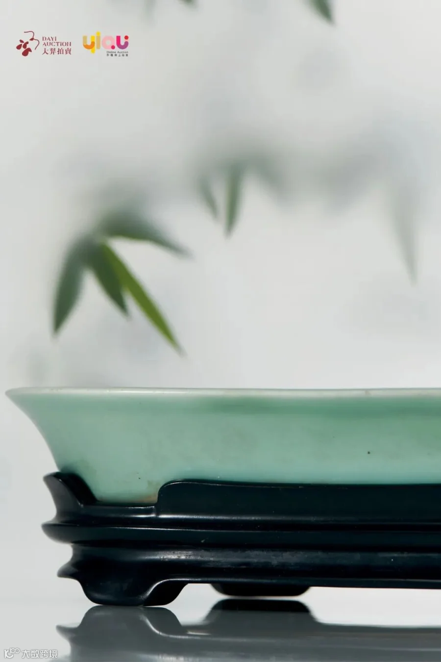 此盘堪称雍正粉青釉的典范之作。釉色古雅,微微泛蓝绿色,犹如玉质,质地厚润清幽,正合古人「类玉」之美称,观之有如青山远黛之美感,外壁剔刻灵芝青竹图,其竹影挺秀,横欹有致,深具宋人小景画之意趣。其下方饰以灵芝图案,寓意吉祥长寿。刻工娴熟,刀法流畅,气脉连贯。其色碧翠怡人,素朴自然,底青花双圈内落「大清雍正年制」六字双行楷书款。所彰显的是雍正御窑一色纯净的另一番唯美境界。