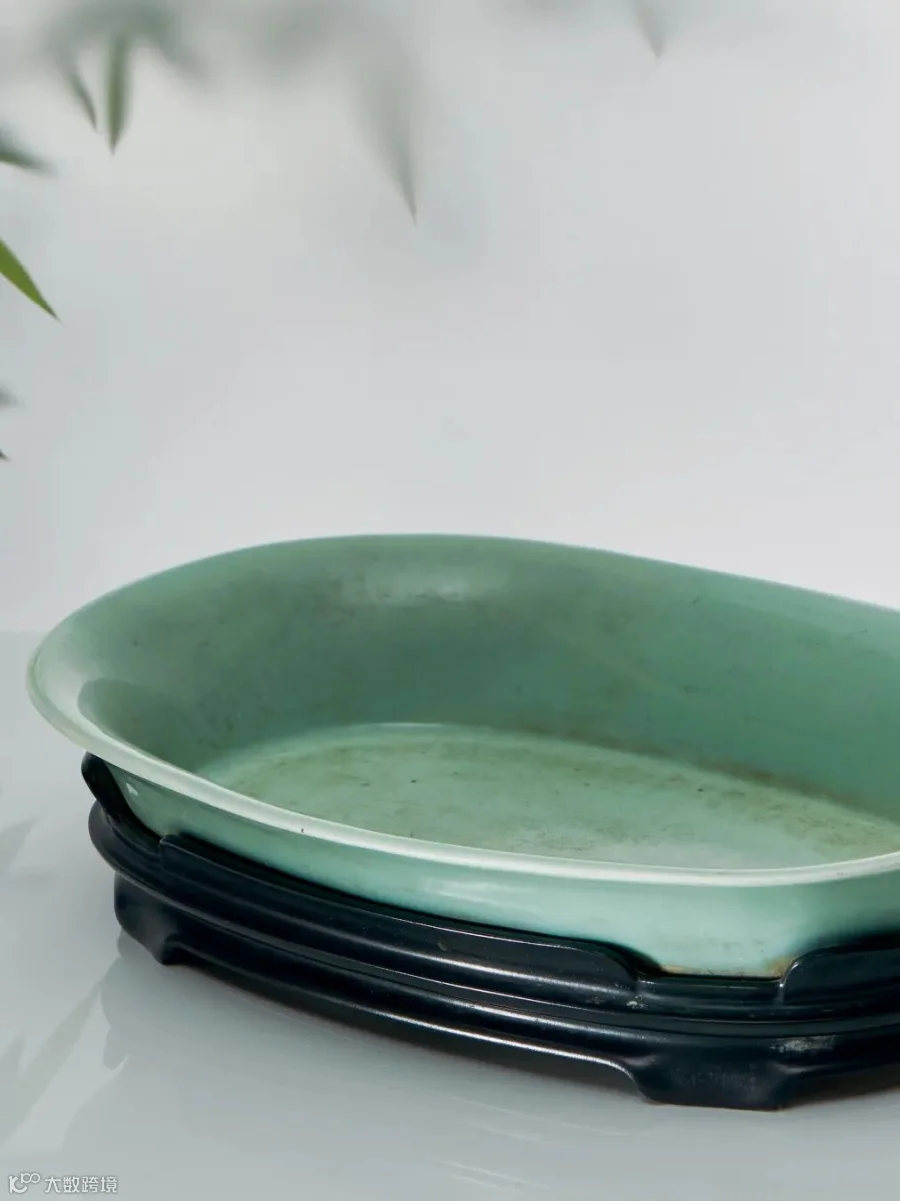 正如LOT820 清雍正 粉青釉椭圆式连座盆古雅隽美,色古而宝光内蕴,质朴而莹润凝厚,魅力非凡,为仿宋器烧成.《陶成纪事碑记》中载“仿米色宋釉,系从景德镇东二十里,地名湘湖,有故宋窑址,觅得瓦砾,因仿其色泽款式。粉青色宋釉,其款式色泽同米色宋釉,一处觅得。"此件粉青釉色泽青绿淡雅,釉面光泽柔和,釉层可施得较厚,使器物的釉色达到柔和淡雅的玉质感,为青釉中最佳色调之一。