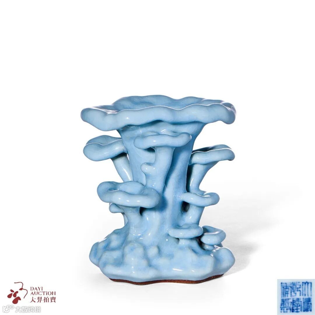 可见乾隆皇帝对此类拍品的喜爱,也佐证了乾隆一朝,摹古之风盛行,造办处所辖各种器皿作坊及景德镇御窑厂纷纷将古代铜器原型,作为器形的蓝本。当古人烧造瓷器游刃有余的时候,就希望用陶瓷来表现另一种内容。乾隆时期,御窑场工匠们烧造技术精湛纯熟,对窑火釉色的控制可至随心所欲之境,加之有杰出的督陶官唐英主持各类精巧器皿的制作,生产出来的仿生瓷器栩栩如生,几可乱真。本次秋拍「重要中国瓷器」专场征集到一件LOT805清乾隆 仿汝釉灵芝花插,其釉色滋润幽静,如雨过天青,细腻如玉,是御窑文房类瓷器的上品。