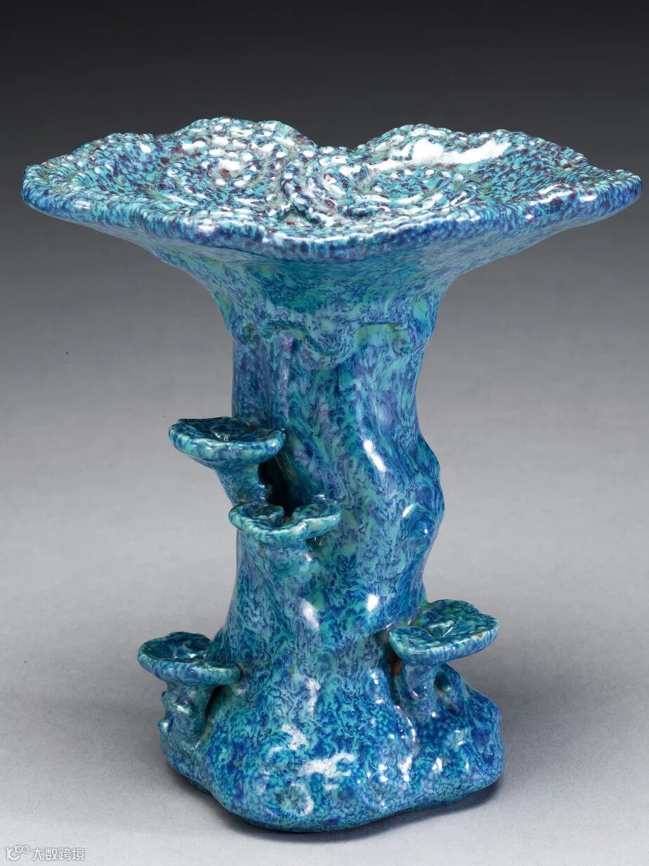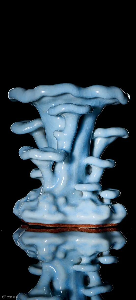 乾隆即位后,对灵芝题材依旧钟爱,御制诗中有《咏文嘉旧端九芝砚》云:“天然池上九芝标,设如良玉喻扬子。”乾隆五十七年清册记载“乾隆五十七年六月初一日立寿意瓷器……收景福交……钧釉灵芝花插二件。”乾隆皇帝嗜好古玩,以灵芝为题材创烧多件珍品,而这件清乾隆仿汝釉灵芝花插,以象生瓷的技法与仿古汝釉相结合,仿古与创新兼得。