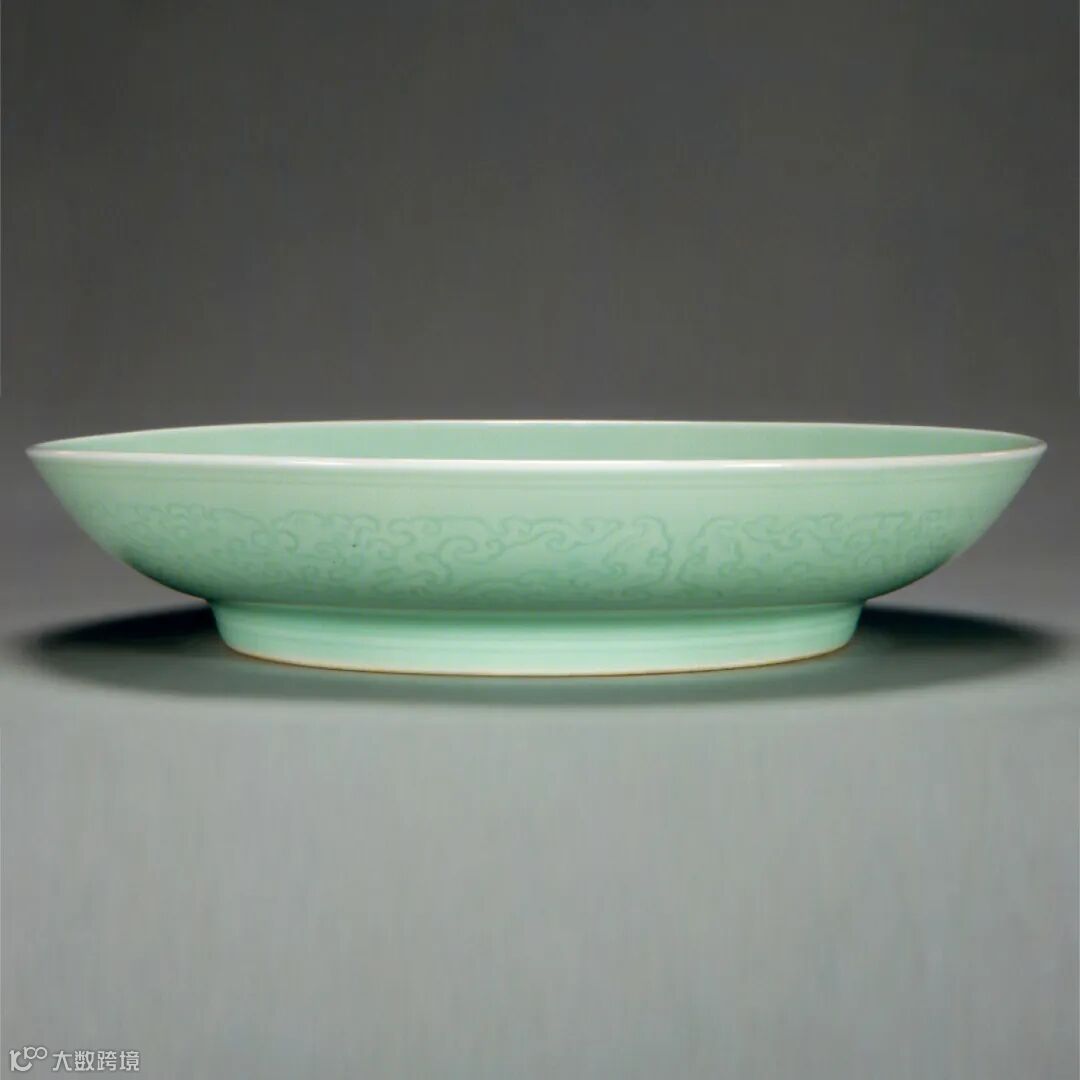 清雍正 青釉暗刻螭龙捧寿纹盘