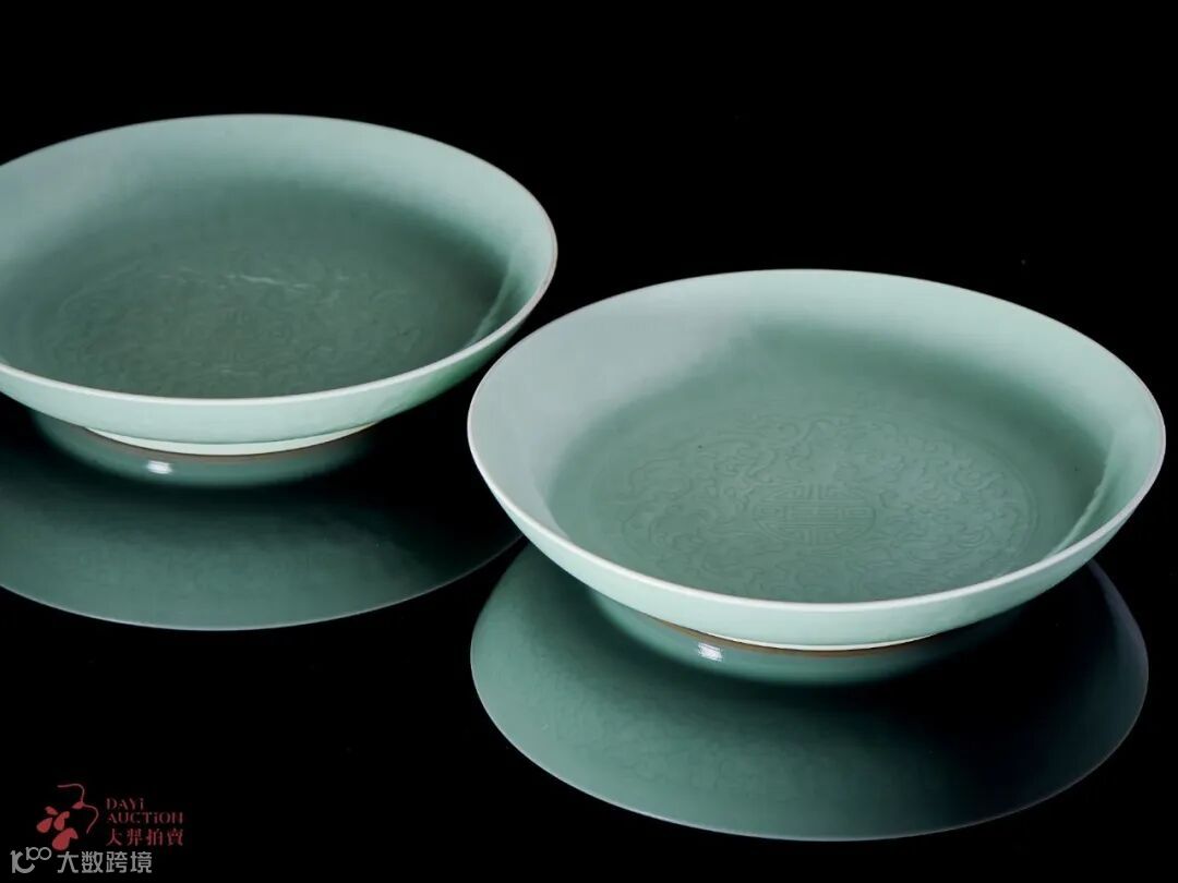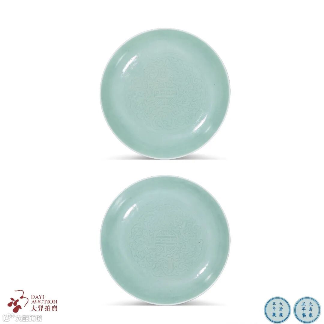 本场另一件宫廷祝贺寿诞之用品,LOT804 清雍正 青釉暗刻螭龙捧寿纹盘一对,通体满施粉青釉,粉青釉是清代青色釉瓷的一种,其色调匀净明洁,釉面细腻光润,为雍正朝经典品种之一。盘心双圈内暗刻双螭龙捧团寿纹,外壁刻两两相对的变形螭龙纹四组。图案繁缛却刻划工整,寓意着对帝王的祝福 。同类器物北京故宫博物院也有收藏,可资比较。