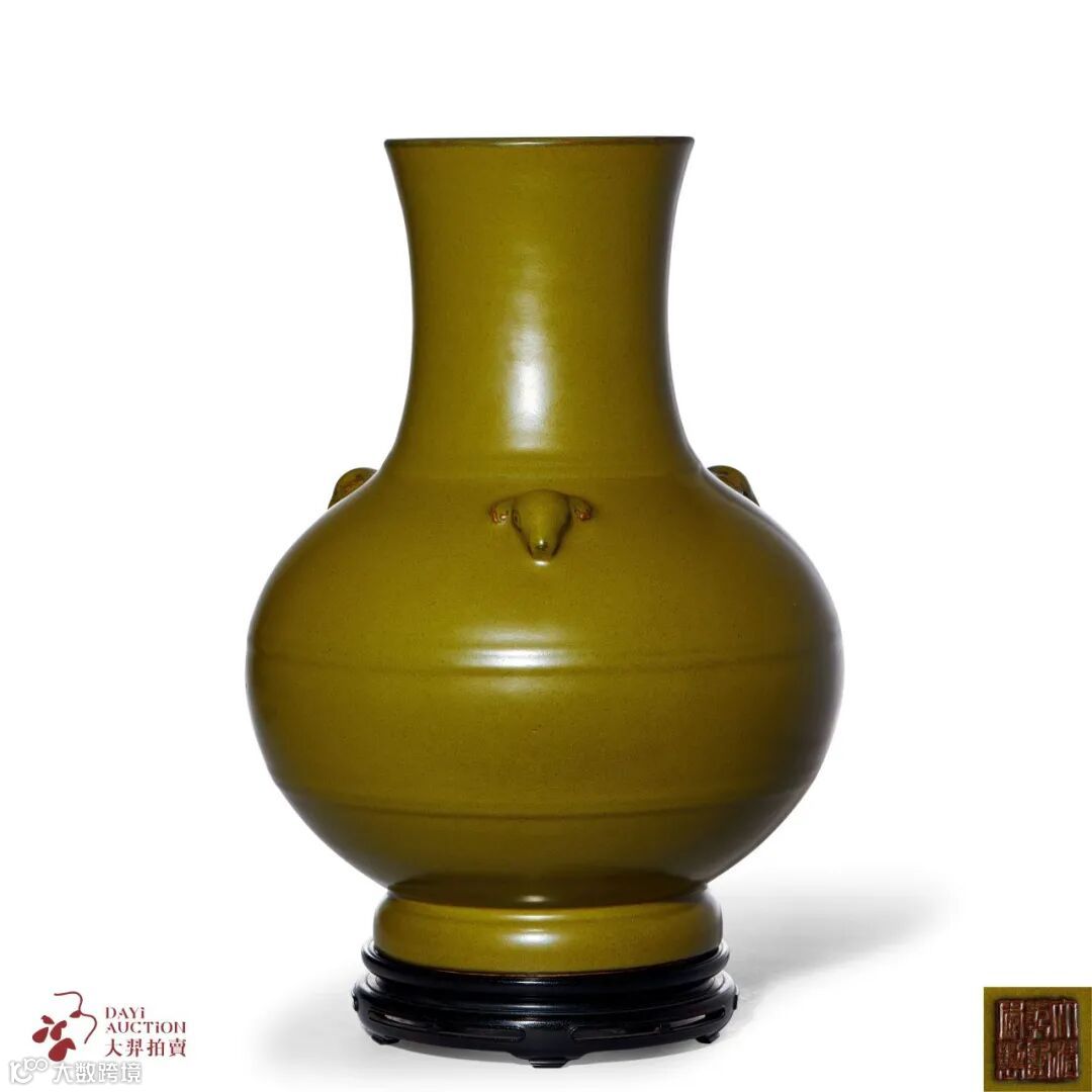 本品以上古青铜为形,以「三阳开泰」寓意天地交而万物通,寄托袪尽邪佞之愿望,所施茶叶末釉肃穆沉着,颇具金铜神韵,器身壮硕,颈腹之间各饰双道凸弦纹共三组,令造型富于线条之变化。肩部堆塑三羊首为耳,羊首高起,形式古朴。