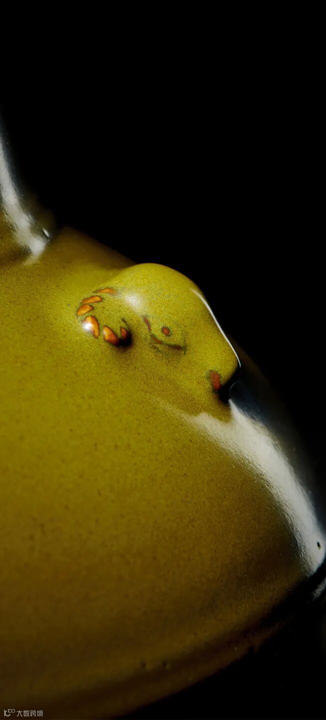 据乾隆三年六月二十五日《内务府造办处活计清文件》记载,乾隆皇帝曾下发“厂官釉三羊尊”让唐英“俱照样烧造送来”,本品应为其中一例。此尊的颜色偏绿,滋润细腻,其中夹杂着的黄黑色细小斑粒灿若晨星,釉面略带鬃眼,根据《陶雅》卷下十八的说法“深绿之有鬃眼者谓之新橘”,因此应定之为典型的厂官釉或茶叶末釉中的“新橘”类,为厂官釉中极为少见的奇品特类。