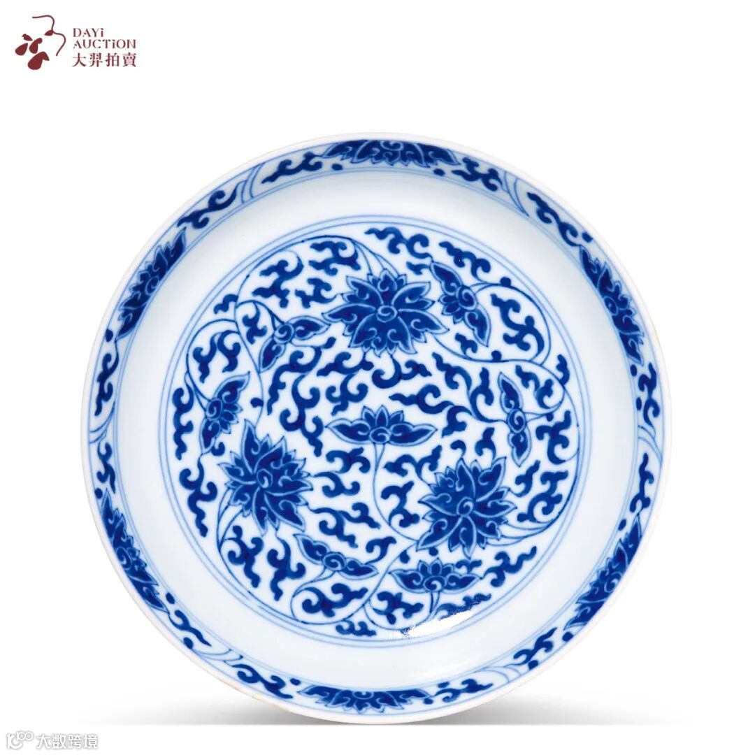 拍品口微侈,弧腹,下承圈足,圈足外墙略内收,内墙竖直,足底修胎精细,足背光滑圆润,为典型的“泥鳅背”。胎体坚白细润,成型规整,匀称而不显厚重,颇有轻盈之感;釉质莹润,表面光洁。盘内外均以青花绘缠枝莲纹,且形态各异。盘内底心亦绘缠枝莲纹,内壁与外壁的缠枝莲纹位置以及花卉形态均十分相似且位置一致,乃有意为之,制作之精细由此可见一斑。