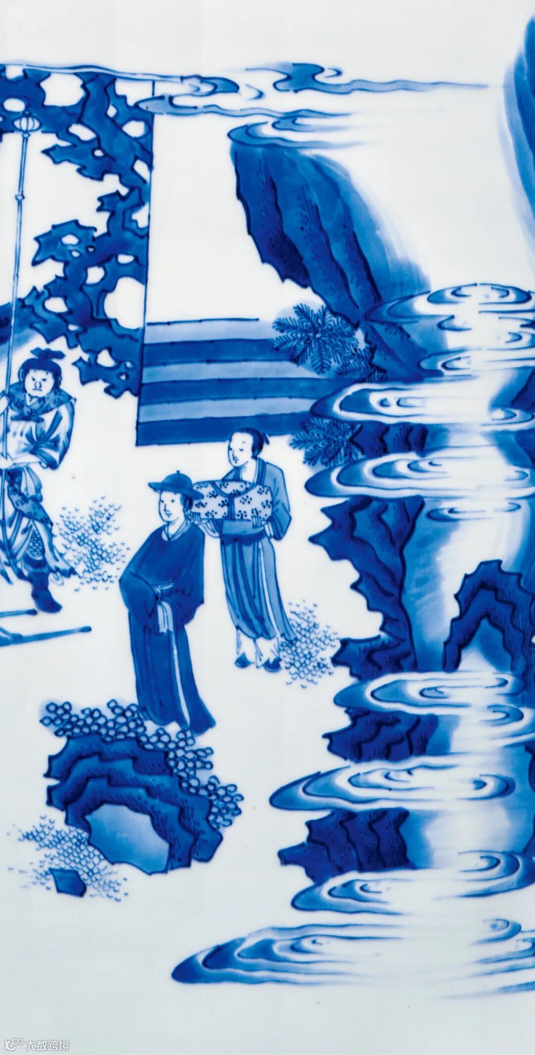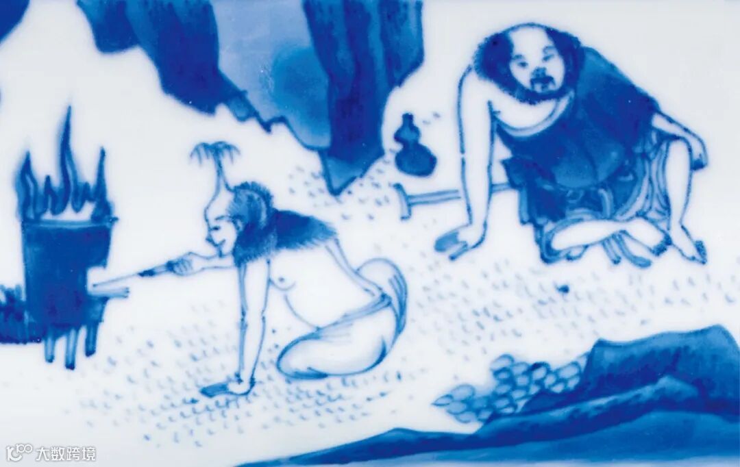 拍品撇口,略束颈,扁鼓腹,圈足。器型沉稳,形制少见。器身内外施釉匀净泛青,外壁通景绘青花吕洞宾铁拐李故事图,人物比例较小,有晚明文人画之意境。铁拐李单手撑地,络腮胡须,坦胸一臂,身后放铁拐及酒葫芦,侃侃论道。