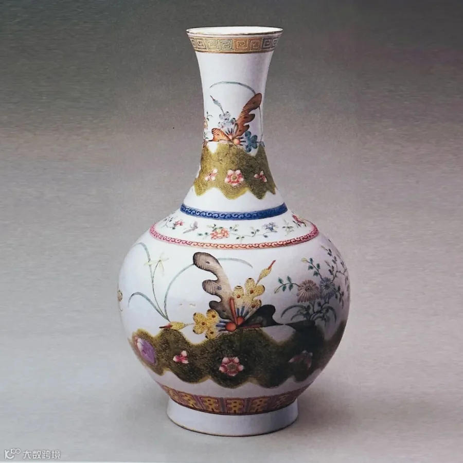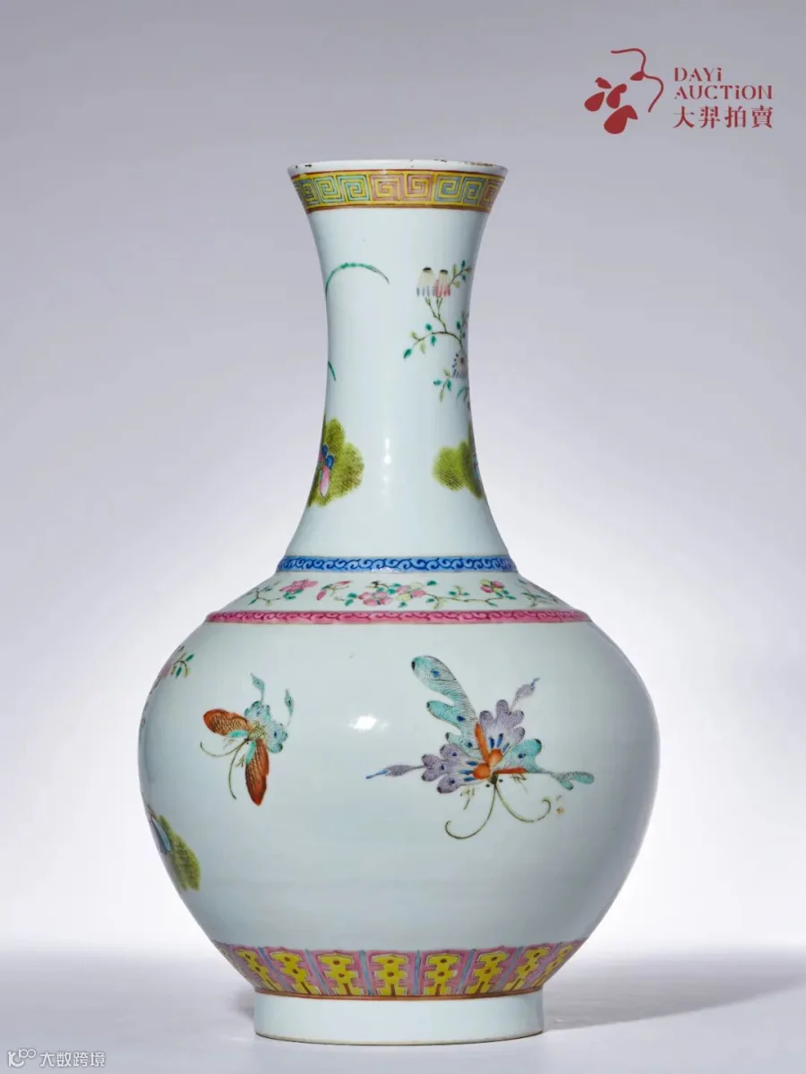 此件赏瓶形制规整端庄,胎釉精良,莹白温润。器身绘蝶恋花纹为主题纹饰,所见彩蝶翩翩起舞,翅羽华丽,笔意工整,描绘流畅生动,宛若趣意盎然的国画小品。“蝶”与“耋”谐音,因此百蝶寓有“寿至耄耋”之意。整器构图繁密有序,笔意工整细致,设色丰富,敷彩精准,衬以纯白釉地,明快妍丽,一派生机盎然。