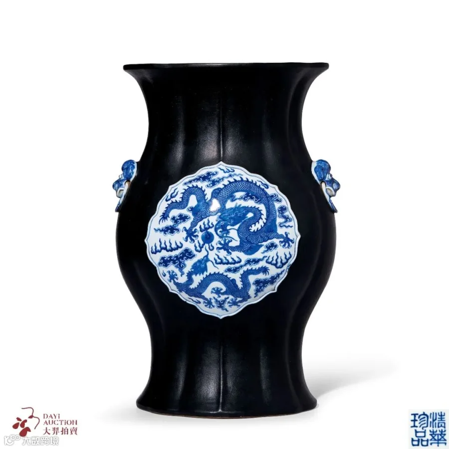 黑釉开光青花苍龙教子纹铺首耳花口尊