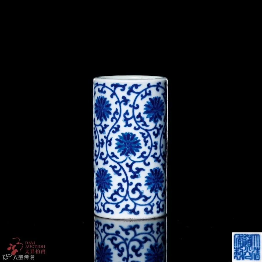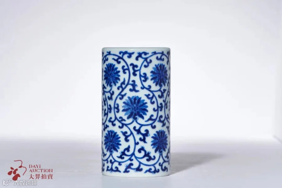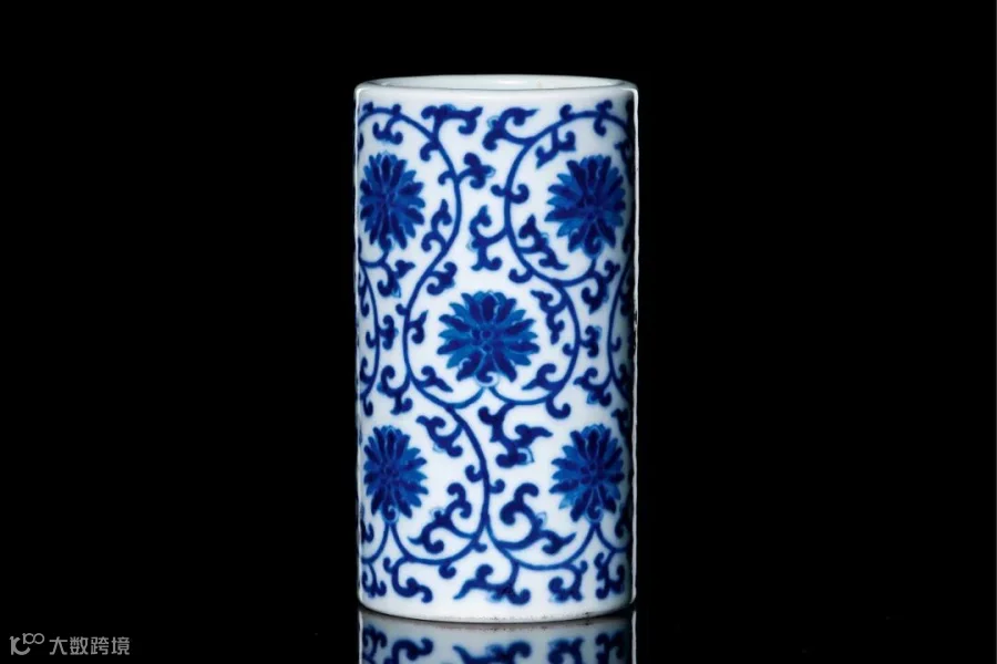 此件笔筒造型独特,花纹繁丽,主体纹饰突出,青花发色翠雅,浑水技法纯熟,并非康熙以来流行的波浪状浑水,而是平整如镜,将清代常用的缠枝莲绘制得规矩精致,富有装饰性。缠枝莲纹饰是缠枝纹的一种,为传统吉祥纹样。因其图案花枝缠转不断,故称缠枝纹,明代称为"转枝"。其构图枝茎缠绕,花繁叶茂,连绵不断,故又具"生生不息"之意。