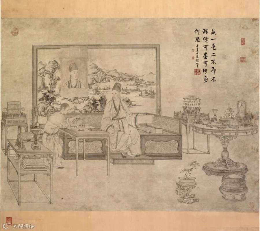 与仇英作品相比,《弘历是一是二图轴》中的陈设细节有了不小的变化。画中,乾隆帝坐在一个罗汉床上,虽房中家具摆放的总体格局没有变化,只是画屏对面的小盆景因为视角的关系,湮没在珍稀古董的光芒之中。从前朝文士风流逸趣的书房,摇身变作堂皇富丽的清代宫廷书斋。