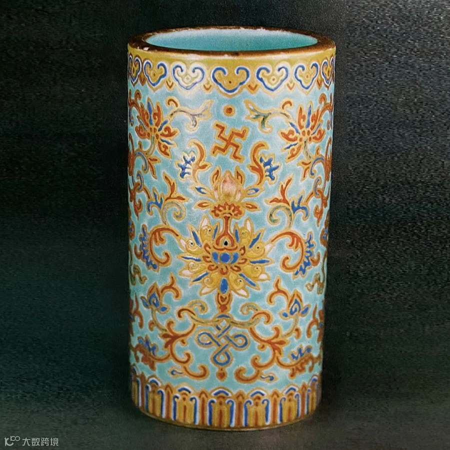 右:清道光 松石绿地描金福庆万年笔筒(香港中文大学藏)