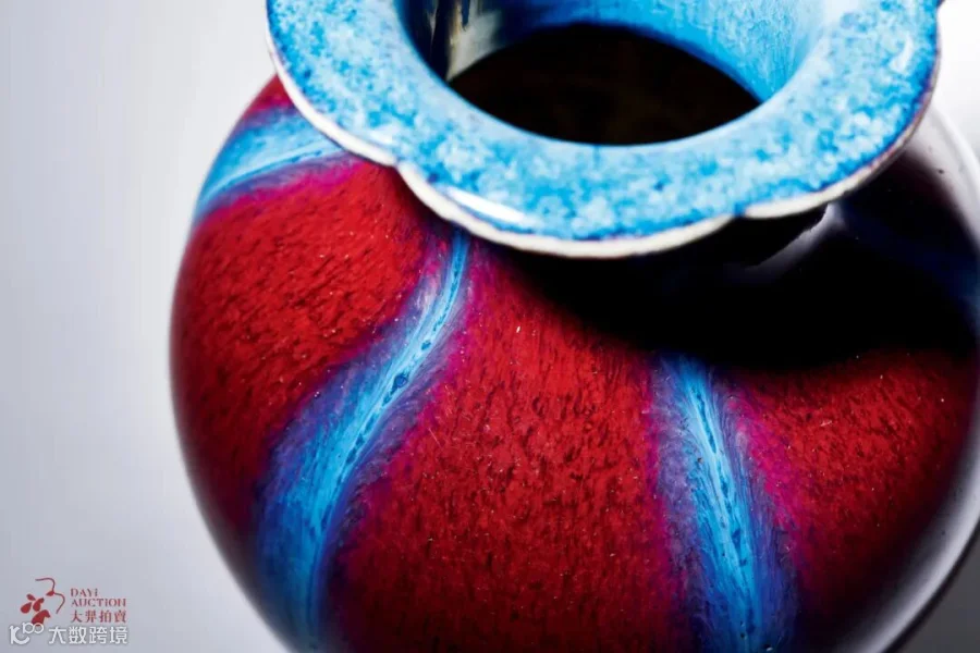 圈足内施黄釉,刻三行六字篆书款"大清道光年制"。石榴造型象征家族血脉之 延续兴旺,宫中陈设石榴尊寄托了皇帝对多添皇子、皇孙的期盼。石榴尊上常施有窑变釉,为清雍正时期景德镇御窑厂仿制宋钧窑创新的品种,色泽变化万千,艳丽有加,极富观赏性。该品类乾隆年间产品较多,道光年制官窑非常少见,窑变如此成色,红蓝釉兼具、唇边一抹月白色更是难得。