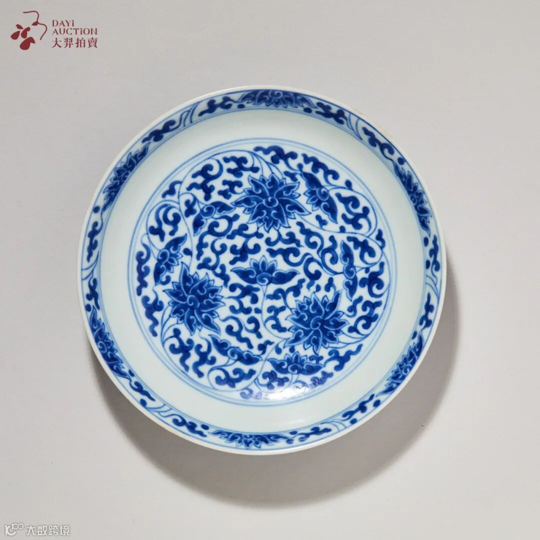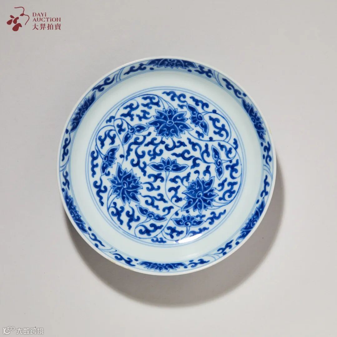拍品口微侈,弧腹,下承圈足,圈足外墙略内收,内墙竖直,足底修胎精细,足背光滑圆润,为典型的“泥鳅背”。胎体坚白细润,成型规整,匀称而不显厚重,颇有轻盈之感;釉质莹润,表面光洁。盘内外均以青花绘缠枝莲纹,且形态各异。盘内底心亦绘缠枝莲纹,内壁与外壁的缠枝莲纹位置以及花卉形态均十分相似且位置一致,乃有意为之,制作之精细由此可见一斑。