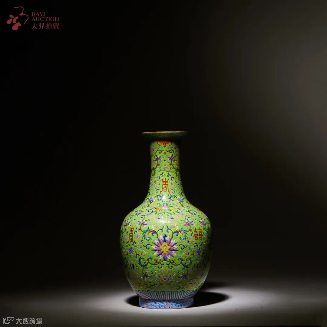 此瓶撇口长颈,丰肩广腹,通体施秋葵绿釉,上以粉彩绘画缠枝宝相莲花纹,器身以宝相花托喜寿纹饰,气息华丽。嘉庆粉彩继承了乾隆一些器物的华缛之风,这种华丽明亮的图像,是统治者为表现太平盛世理想所需要的。