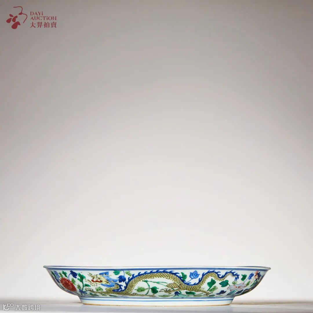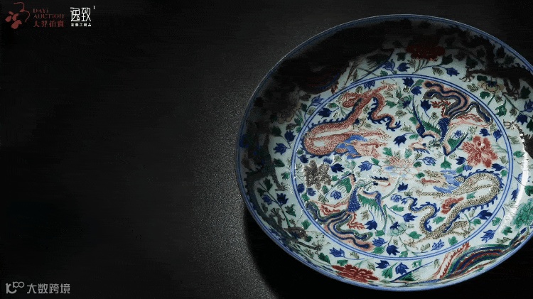 拍品属康熙御窑青花五彩典型器。敞口,弧腹,圈足,胎质细腻,釉面匀净紧致。盘内、外壁皆以五彩绘龙凤穿花纹为饰,飞龙舞凤,构图繁密,画意华美。盘心双圈内饰追龙赶凤,围绕中心间次排列,龙凤各二,四首相对,中间以牡丹花卉间隔开来;