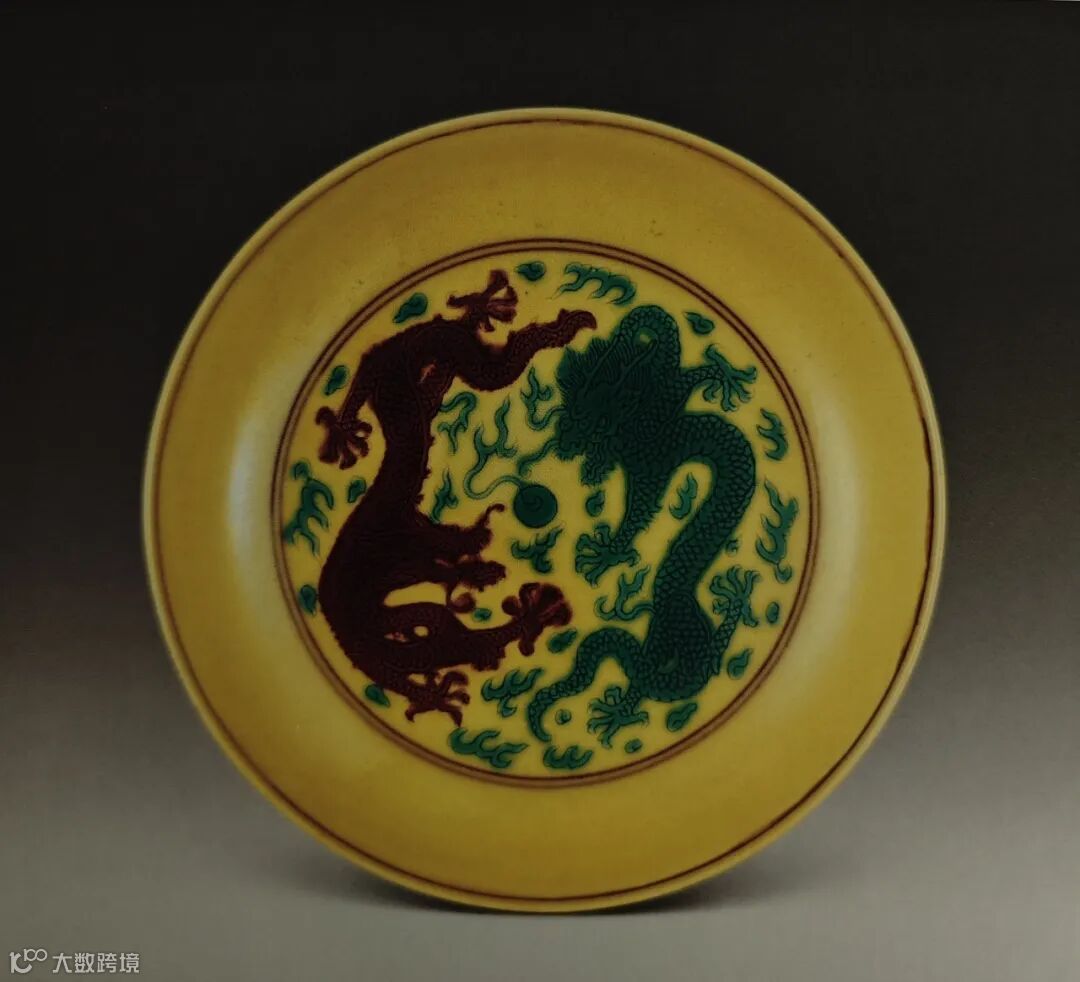 附图:北京故宫博物院藏 清乾隆 黄地素三彩龙纹盘