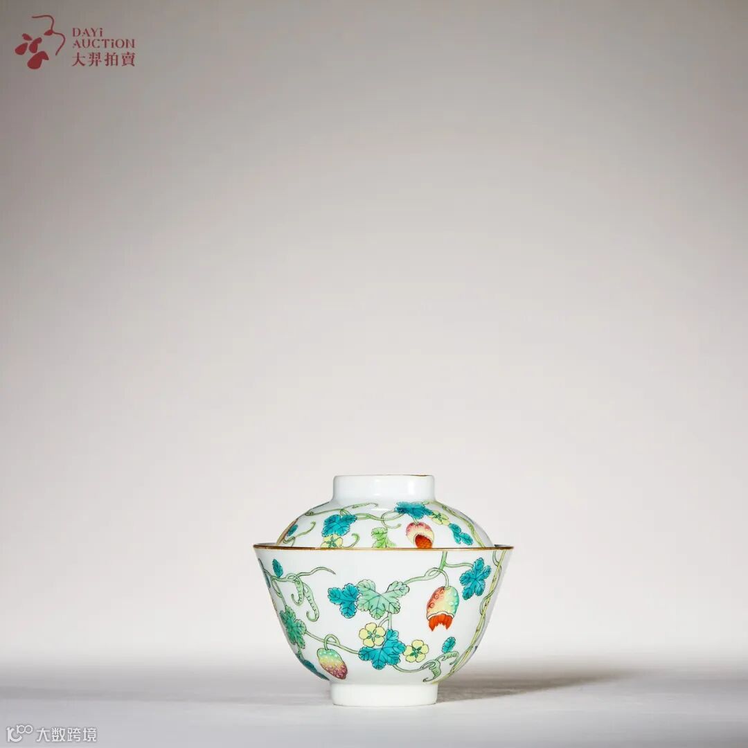 碗敞口微撇,弧腹,下承圈足,上配半拱形盖,造型规整,比例和谐。釉色清润洁白,粉彩绘过枝癞瓜图,竹枝、瓜叶以青绿两色绘就,以示阴阳反侧,竹枝纤长挺拔,瓜藤蔓延舒展,丰叶垂实,叶间开数朵淡黄花,清新雅致,癞瓜凸瘤斑斑,果实裂开,饱满瓜瓤垂而外流。纹饰由碗外壁攀爬过枝延伸至内,内外装点灵动巧妙。