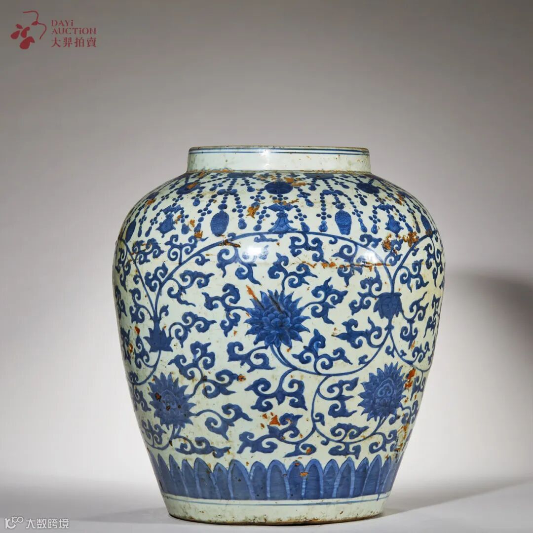 大罐直口,丰肩,圆鼓腹。器形高大壮硕,气势雄浑,胎体坚致。外壁通体施青白釉,釉层光亮平滑,质感温润。器身以青花绘缠枝花卉纹,肩部绘一周璎珞杂宝纹,颈部绘一周蕉叶纹,纹饰满密,绘风古拙。万历一朝所出大罐,往往竭众匠之力尚难为之,更有烧造难成之苦,百中不得一二之虞。许之衡《饮流斋说瓷》中曾有记载:“转枝莲托百宝或转枝莲托百寿字,此种奇制,配置极难”。全器青花发色纯正,明艳清丽,纹饰构图饱满,层次清晰,绘工精致,赏心悦目,笔触率意,风格热烈奔放,生动传神,极具万历青花天真烂漫,草昧初开的独特韵味。