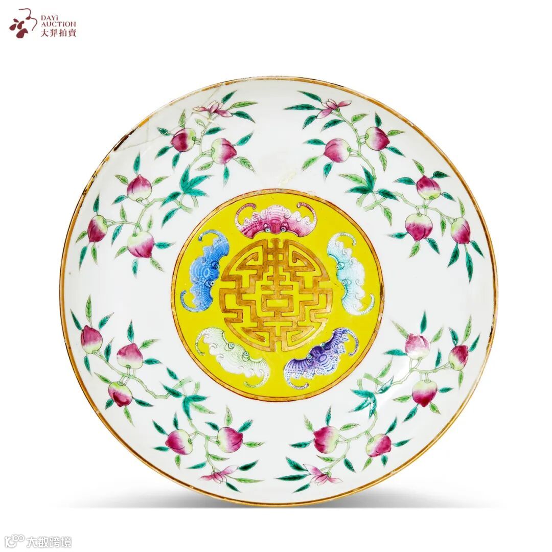 拍品敞口,浅弧腹,圈足。口沿描金彩,盘心以黄地粉彩五福同寿图,外围四组寿桃纹点缀,每枝上结五个仙桃。仙桃,如意,祥蝠,寿纹,无不瑞意祥吉,喜气万分。色彩浓淡相宜,典雅规整。外壁白地上绘三组缠枝花卉,清新淡雅,朴拙宜人。底书“大清光绪年制”六字双行楷书款,隽秀工整。此盘器形周正,纹饰设色丰富艳丽,画面构图规整,为清代官窑之佳品。