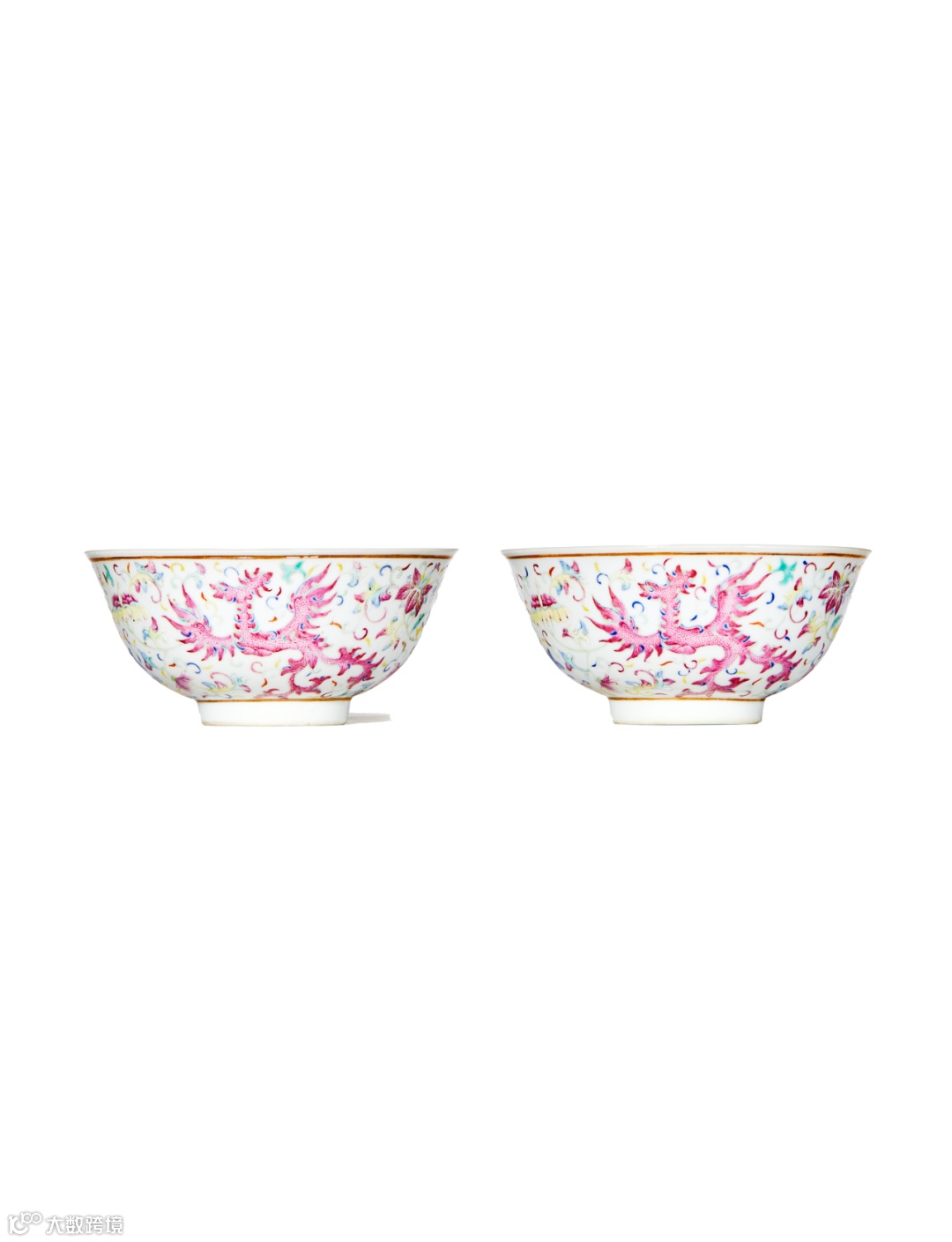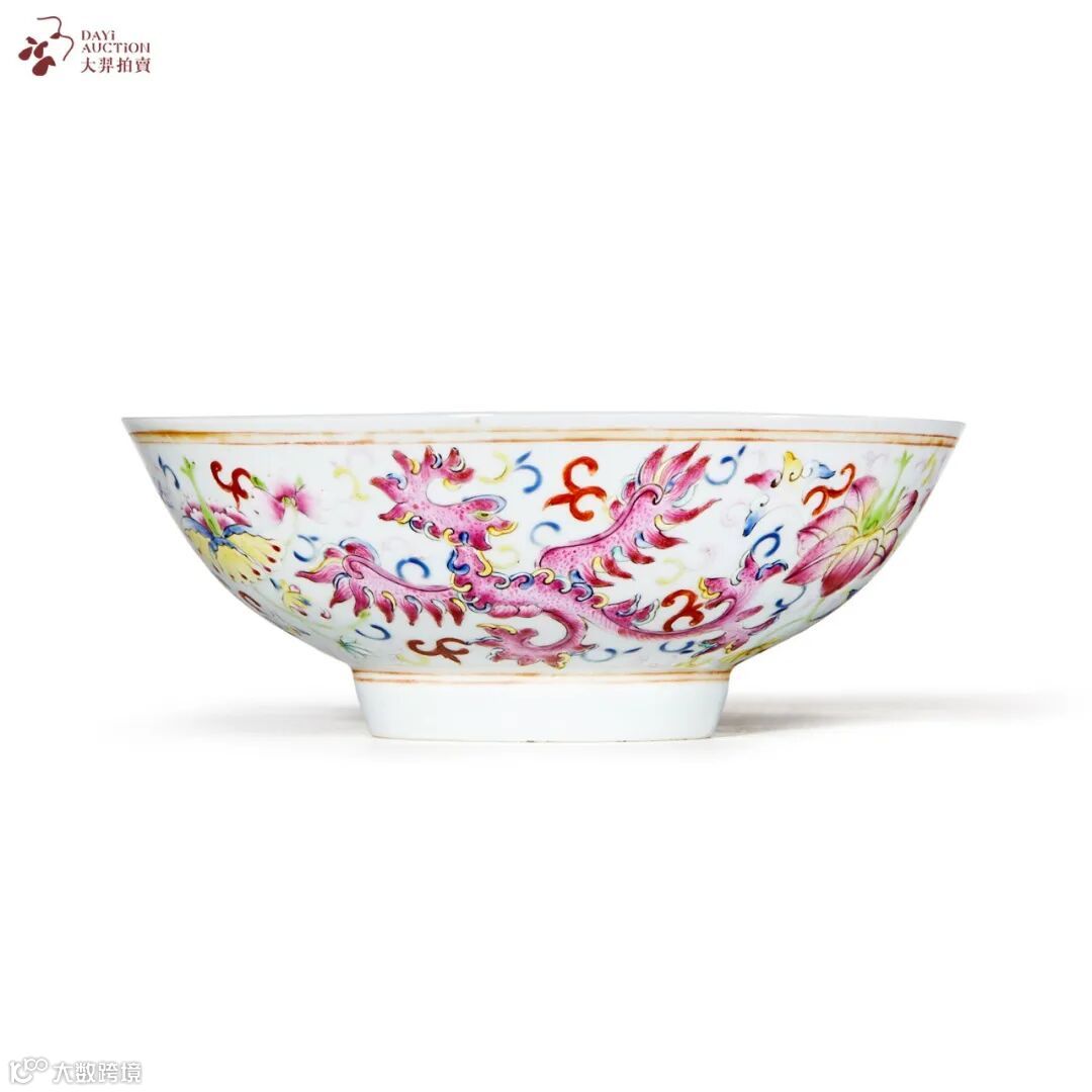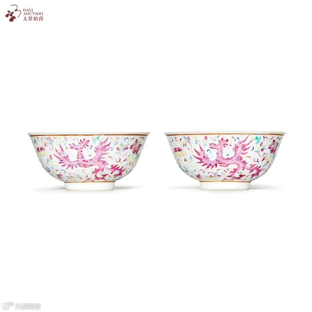 此对拍品为晚清官窑粉彩经典品类,碗形规整,胎釉精良,外壁以粉彩满饰夔凤纹、缠枝花卉纹,各色夔凤与周边花朵翅蔓相绕,繁而有序。釉色缤纷绚丽,表现夔凤的胭脂红、天蓝彩等油质感强,口沿、近足处以金彩描边,尤添华贵之气。