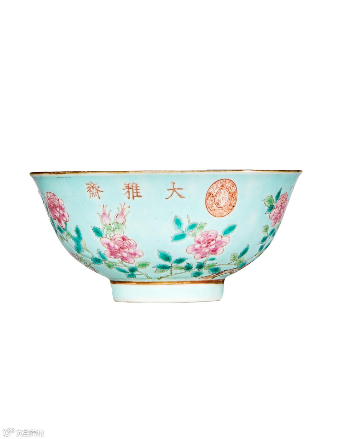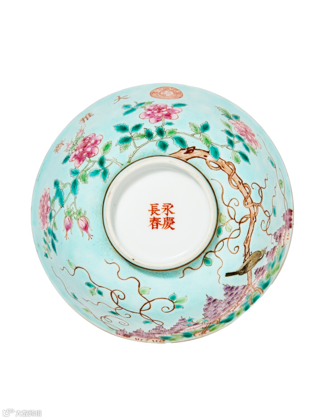 此碗敞口微侈,弧腹,下承圈足。外壁通施松石绿地,其上以粉彩绘紫藤牡丹纹样,藤蔓缠绕,诸芳似随风荡漾,娇艳无比,所绘花叶尽显轻盈之姿,诸彩研丽而不俗,出色匀凈明亮,口沿下以矾红书“大雅斋”三字楷书款,旁钤矾红双龙戏珠纹“天地一家春”篆书阳文印。碗内及外底施白釉,底心矾红彩书“永庆长春”四字双行楷书款。