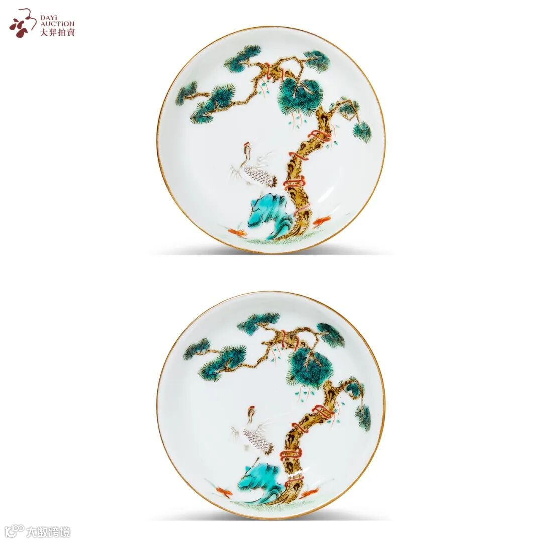 本品成对保存,敞口,弧腹,圈足。通体粉彩绘就,盘心绘松鹤图,仙鹤信步树下,羽翼丰盈,松枝曲折虬劲,蝙蝠飞翔,笔触细腻,寓意福寿双全。画面布局舒朗,意境清幽,绘笔娴熟,色彩和谐典雅。底部落款“江西瓷业公司”六字,书写俊逸,排列规整。