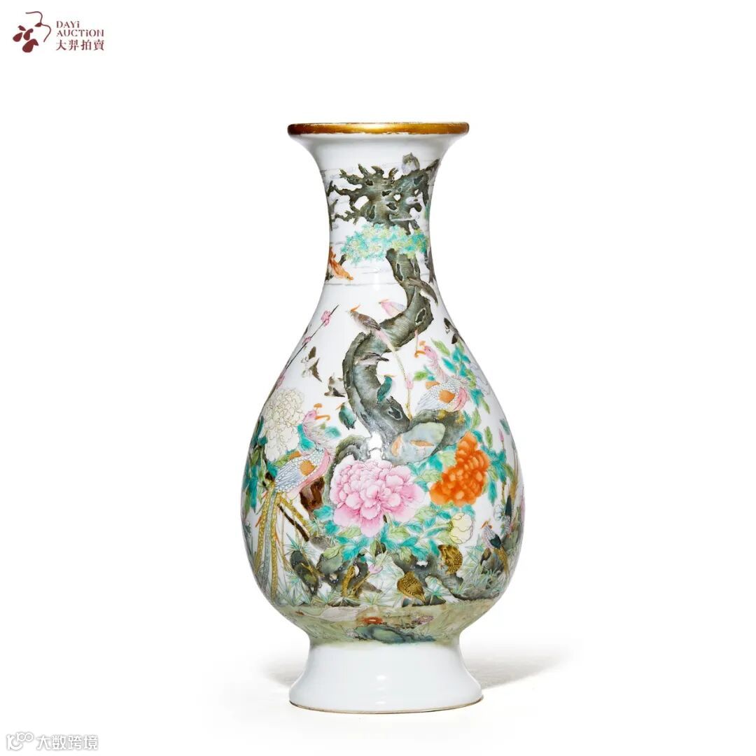 瓶撇口长颈,溜肩垂腹,圈足。器身以粉彩通绘百鸟朝凤图,鸾凤傲居洞石之上,气宇非凡,树木倚斜而出,周围诸鸟形态各异,或两两翱翔,或栖立枝头,牡丹盛开,色彩绚丽,雍容华贵。本品描摹精细,笔触分明,毫发丝缕分明,刻绘淋漓尽致。底部书“居仁堂制”四字双行篆书款。“居仁堂制”款瓷器,是时任袁世凯府管家郭葆昌在景德镇督烧的“御用”瓷器,其工艺水准可与清代御用官窑比肩。“居仁堂”即为袁世凯当时居住、办公所在地。