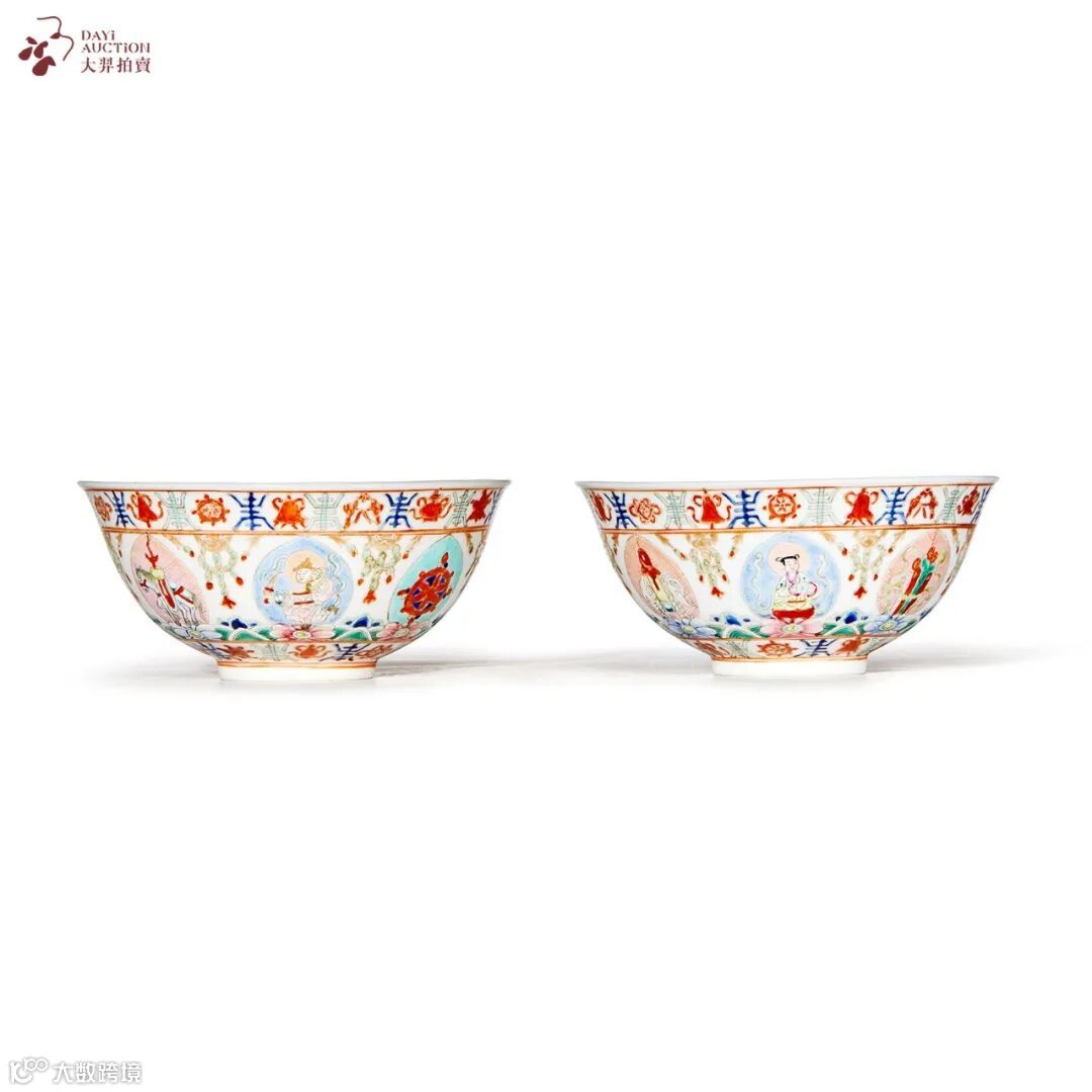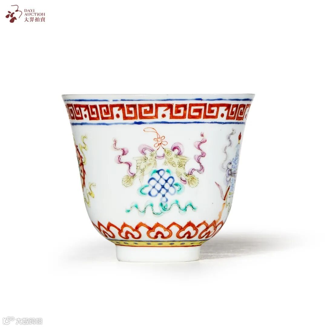 拍品敞口,深腹,圈足,沿壁处以红彩绘回纹一周,外壁绘粉彩八宝纹图案,近足部以红彩绘如意纹一周,底施白釉,矾红彩书“大清光绪年制”六字双行楷书款。整器造型典雅,构图疏密有致,画工精细,色彩艳丽,胎质洁白细腻,釉水莹润,是晚清官窑粉彩传统器中的典型器。