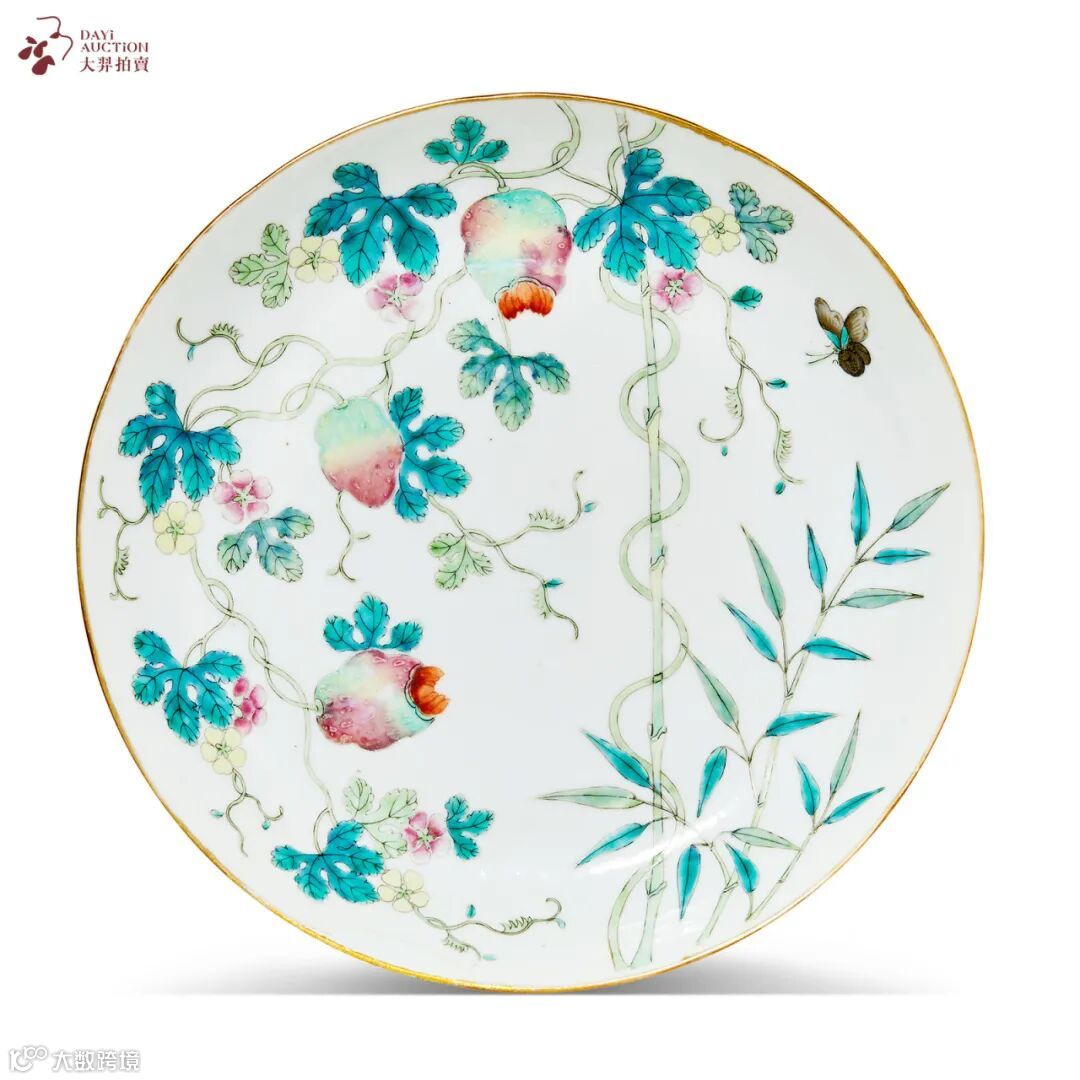 拍品撇口,浅弧腹,平底,圈足,形制规整,胎骨坚致,釉质细润。通施白釉为地,釉面润盈,内外壁以粉彩饰癞瓜绕竹纹,癞瓜牵藤,间夹翠竹,瓜瓞绵延。竹枝挺秀,构思巧妙,刚柔并济。整器绘工精湛,诸色相宜,清丽动人。癞瓜纹是中国传统的祥瑞图案,意指「瓜瓞绵绵」,寓意福寿绵长,子孙绵延,兴旺美满。