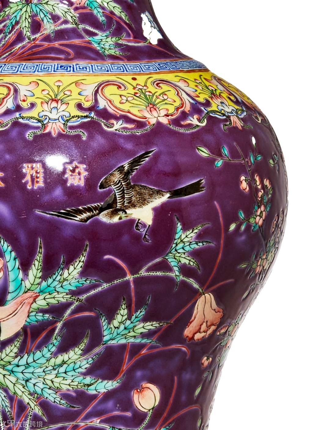 拍品以蓝紫彩为地,通景绘粉彩花卉图案,一幅暖意融融、生机勃勃的田园美景。外壁矾红署“大雅斋”款,底以矾红署“永庆长春”款。本品设色淡雅柔和,笔触精致细腻,纹饰布局繁密有致,画面饱满丰富,为清代粉彩器之佳品。 大雅斋瓷器为晚清时期继慎德堂之后最为显赫的堂名款瓷器,其纹饰一改传统官窑常见的龙凤、缠枝花卉题材,代之绘以各式灵禽花卉,尽显意境清新、隽雅气息,其绘画之细,施彩之精,独步一时,为同光御瓷所不能比。