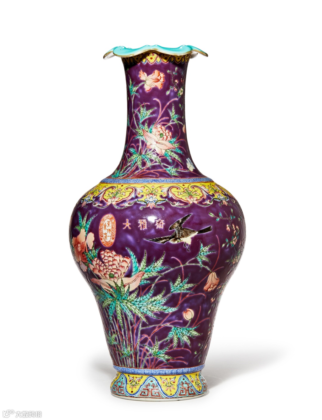 瓶花口外撇,长颈,丰肩,弧腹下收,线条流畅柔美,颈部、肩部及颈部施黄彩为地,上绘如意花卉等纹饰,腹部及颈部通施胭脂紫釉为地,上绘花鸟纹饰,荷塘丽景,寒梅朵朵,竞相争艳,一侧雀鸟轻盈飞舞盘旋半空,翅羽丰满,翎毛华丽,熠熠生彩。全器色彩华丽,紫彩浓郁,黄彩明快,绿彩清新,粉彩柔雅,色诸色交融,和谐雅致,实为民国陈设佳作。