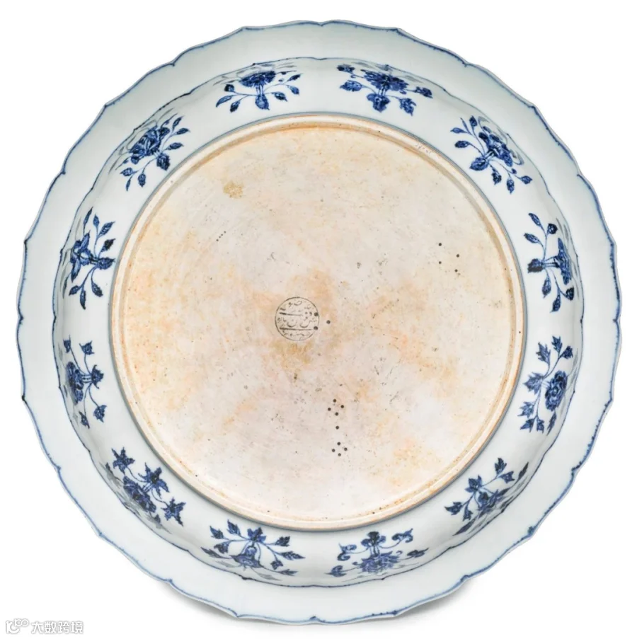 明朝青花瓷器在原有的造型上有了很大的突破,特别是在永宣时期,出现了各种各样的类型,例如:天球瓶、双耳扁瓶等类型,主要是根据当时社会的流行样式的发展进行的改变。此式葡萄大盘多见圆口造型,而如本品这般的菱形口则较为少见,更显独特珍贵。