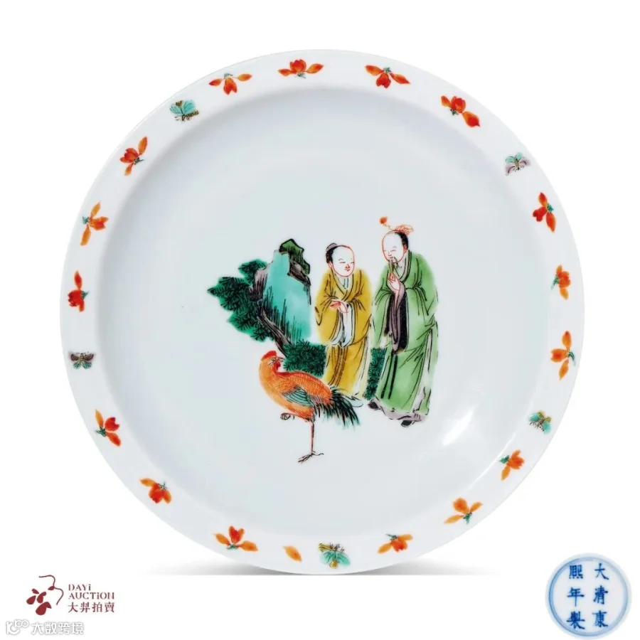 五彩以康熙为极致,绘画工致精丽,尤在人物、山水纹饰上造诣显著。上海博物馆藏有一件五彩高士图折沿盘,尺寸与本品相同,折沿边饰也与本品相同,当属成套烧制,以不同人物故事入画,对读成趣,让我们得以一窥当时市井生活的闲适与自在。