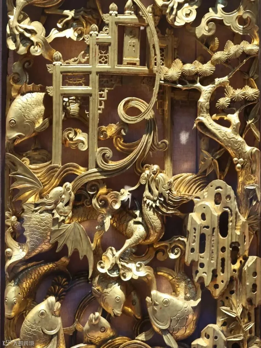 据《太平广记》载:“龙门之下,每岁季春有黄鲤鱼,自海引诸川争来赴之。一岁中,登龙门者不过七十二,初登龙门,即有云雨随之,天火自后烧其尾,乃化为龙矣。”「鱼化龙」又称「鲤鱼跳龙门」,传说凡能跳上龙门的大鱼,便可变化成龙,是中国古代传统纹样之一,因古时科举考试场所所贡院的正门也称「龙门」,因而有科举金榜题名,声名显赫的寓意。所绘的“鱼化龙”图,寓意古代文人科举成功后人生转向飞黄腾达。