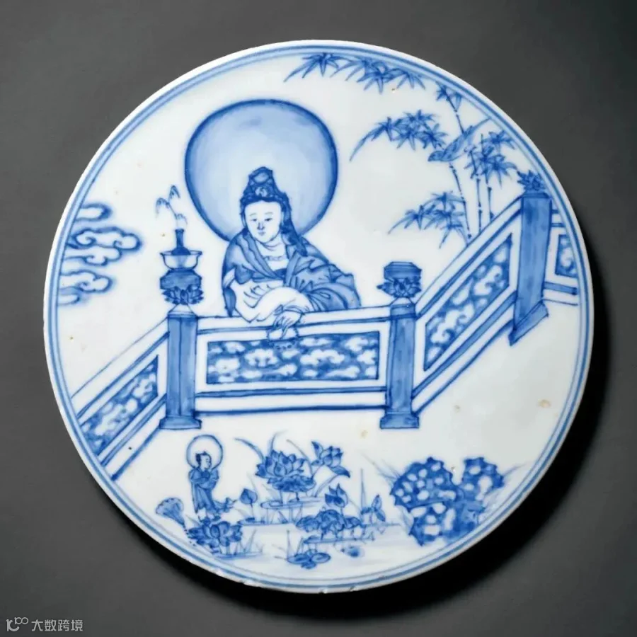 青花瓷板绘画不同于纸上绘画,意境和效果全在烧造后才能体现,它是中国绘画和工艺结合的产物,又为泥与火的艺术。此板以平等青为主作为绘画原料,施釉厚薄适度,烧造时占据最好的窑位以达到最佳的温度,青花发色妍丽而变化丰富,笔触细致,釉质如脂似玉,微呈卵青色,具有成化青花瓷器的典型特征,与国内拍卖行释出的拍品相较,纹饰或笔触极为相似,可资参考,让我们感受到了宗教信仰的神圣与庄严。