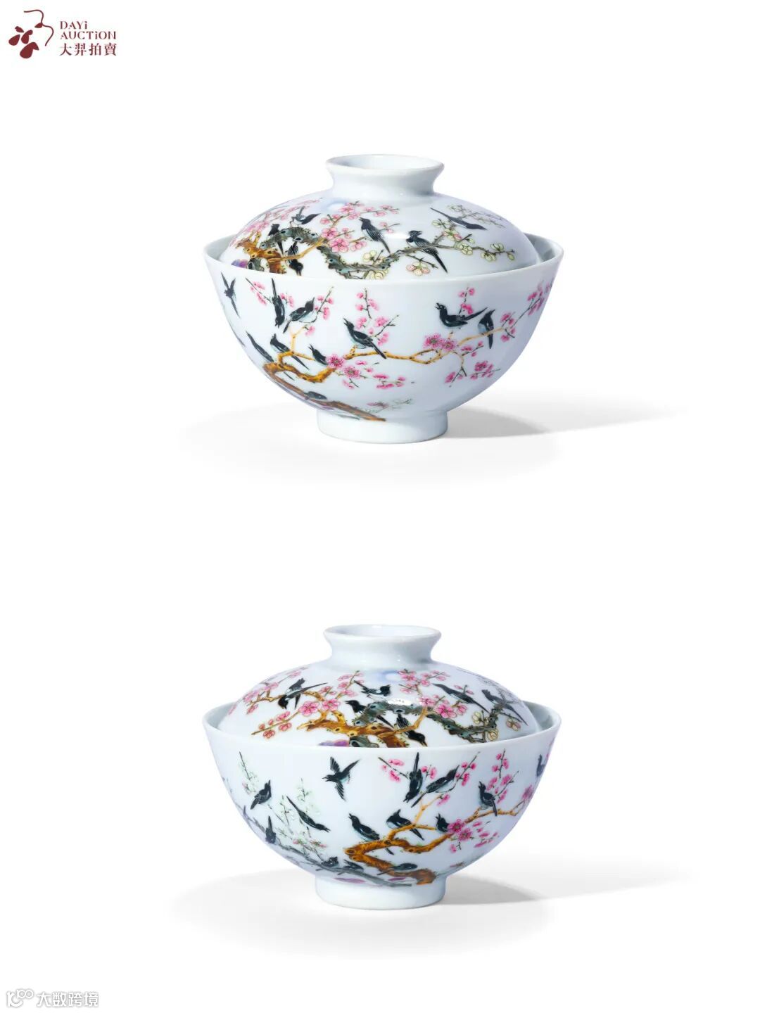 清乾隆 粉彩“日日进喜”喜鹊登梅图盖碗,通体罩施白釉,其上以粉彩装饰喜鹊登梅纹样,绘两株并蒂梅树,繁花之间,喜鹊登梅,俯仰生姿,各具情态,一翎一羽,活灵活现,呈现一派欢喜明媚的景象。