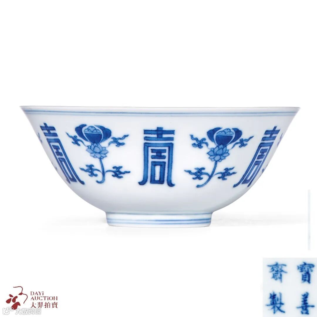 本品敞口,弧腹,圈足,胎质细密,釉色光洁温润。通体纹饰青花绘就,外壁绘折枝宝莲纹,上托瑞果,间以等距”寿“字纹,内壁绘数组寿桃纹,碗心双圈内绘缠枝瑞果纹,寓意多福多寿。