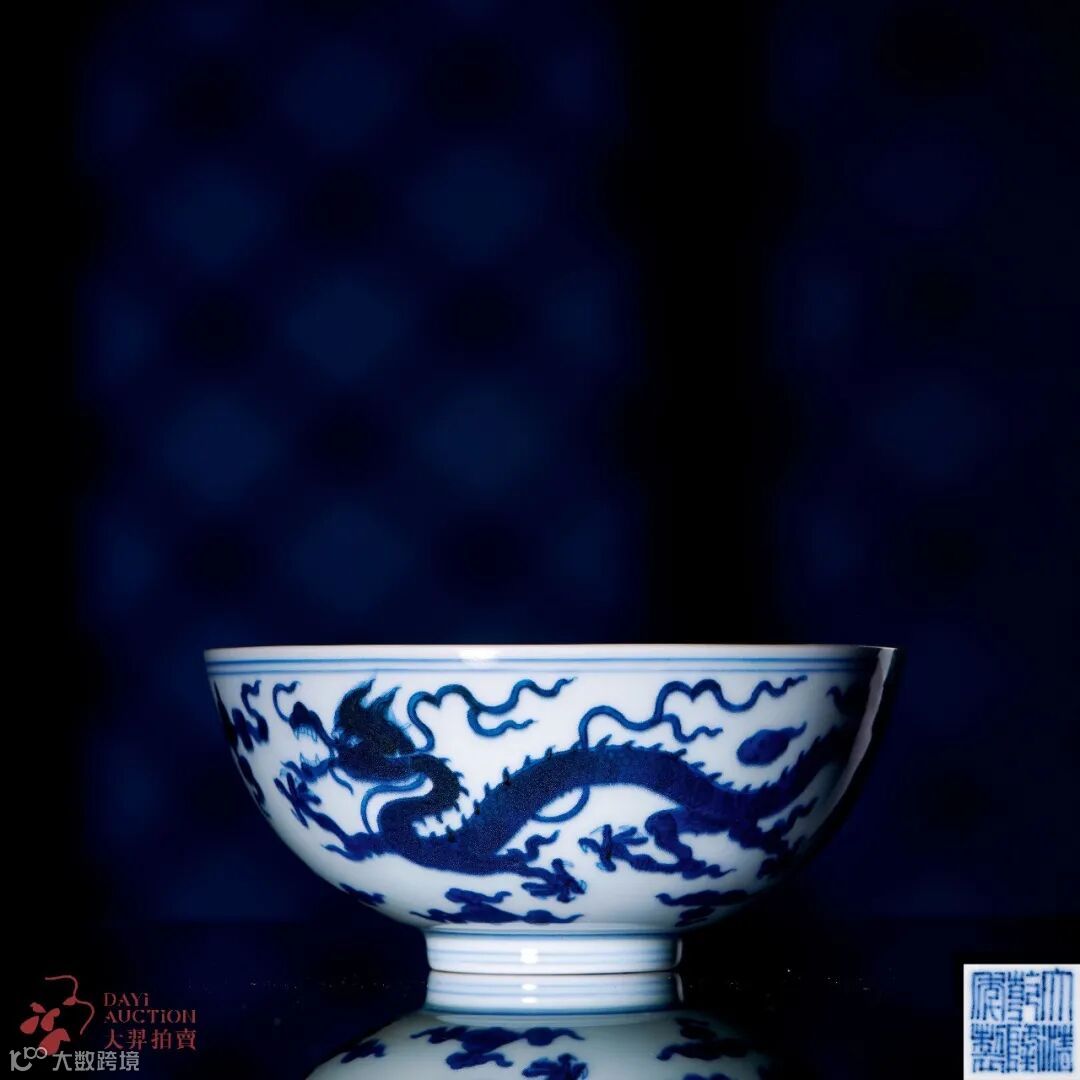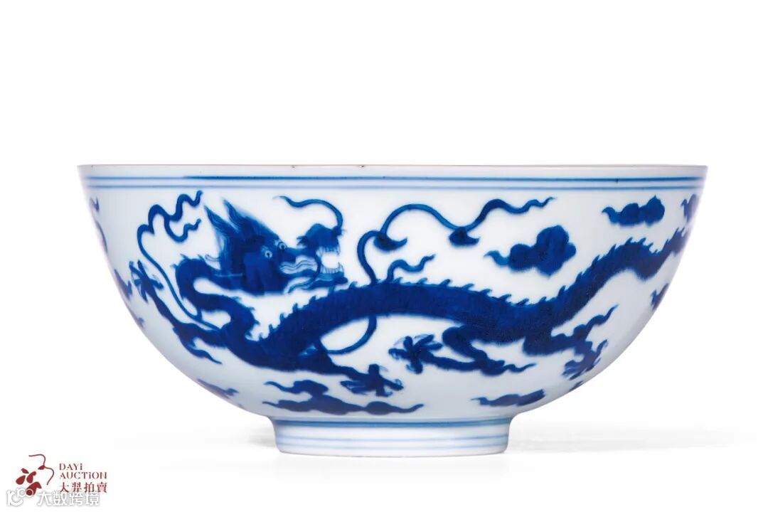 拍品敞口,弧腹,圈足。通体青花为饰,碗心双圈内绘团龙纹,外壁绘两条行龙,首尾相接,一前瞻,一后顾,矫健凶猛,极富动感,双目圆睁,须发横飞,竖角张吻,五爪如轮,肢体矫健,遒劲有力。