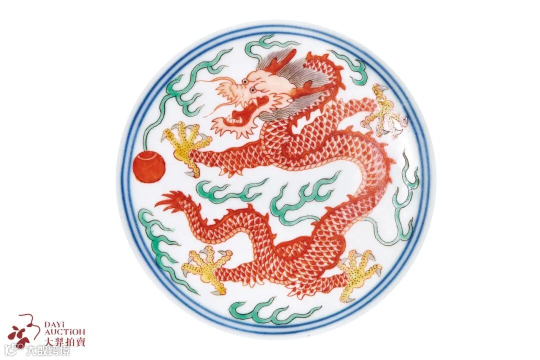 本品敞口,弧腹,圈足。盘内壁施白釉为地,盘心及外壁均绘海水龙纹,海浪汹涌滔天,层层迭起,龙身上下翻腾,龙须向上飞扬,龙爪有力怒张,腾跃海上,气势威猛。此拍品造型规整,胎质细腻洁白,画工精湛,青花色泽淡雅,矾红清新艳丽,极具层次感。