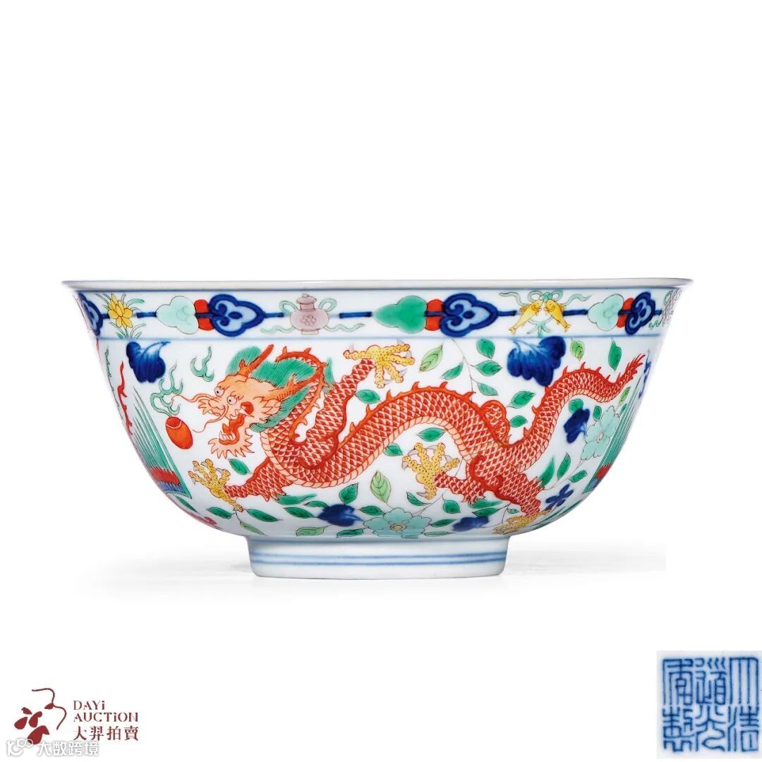 内壁青花双圈内饰矾红行龙戏珠图。外底心以青花书“大清道光年制”六字三行篆书款。此五彩龙凤纹碗是清代官窑最为典型的品种之一,因纹饰喜庆,深受各代皇帝喜爱,可见从康熙至宣统朝都有烧制。