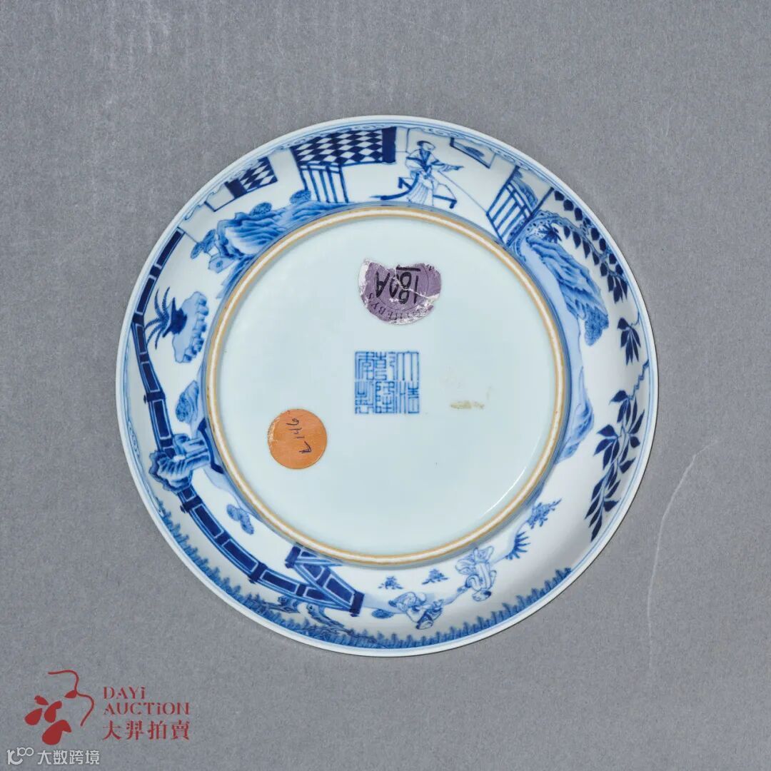 盘器外壁环周作屋室庭院景致,清雅宁静,沿口作卷云装饰,宛若仙宫幻境,意境玄妙。纹饰描绘规矩细致,图饰清朗悦目,青花发色醇雅,器形饱满丰圆。底青花落“大清乾隆年制”六字三行篆书款,为官窑典型之作。