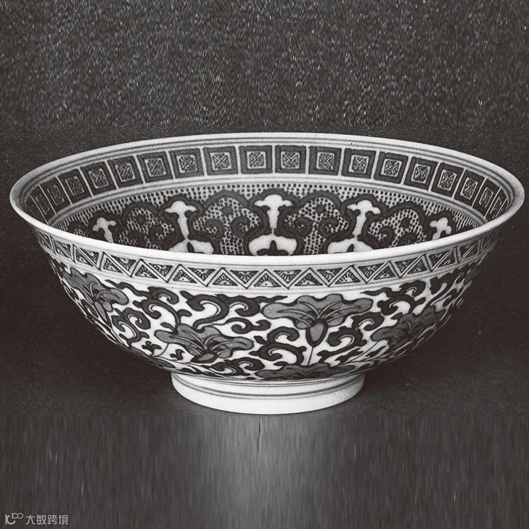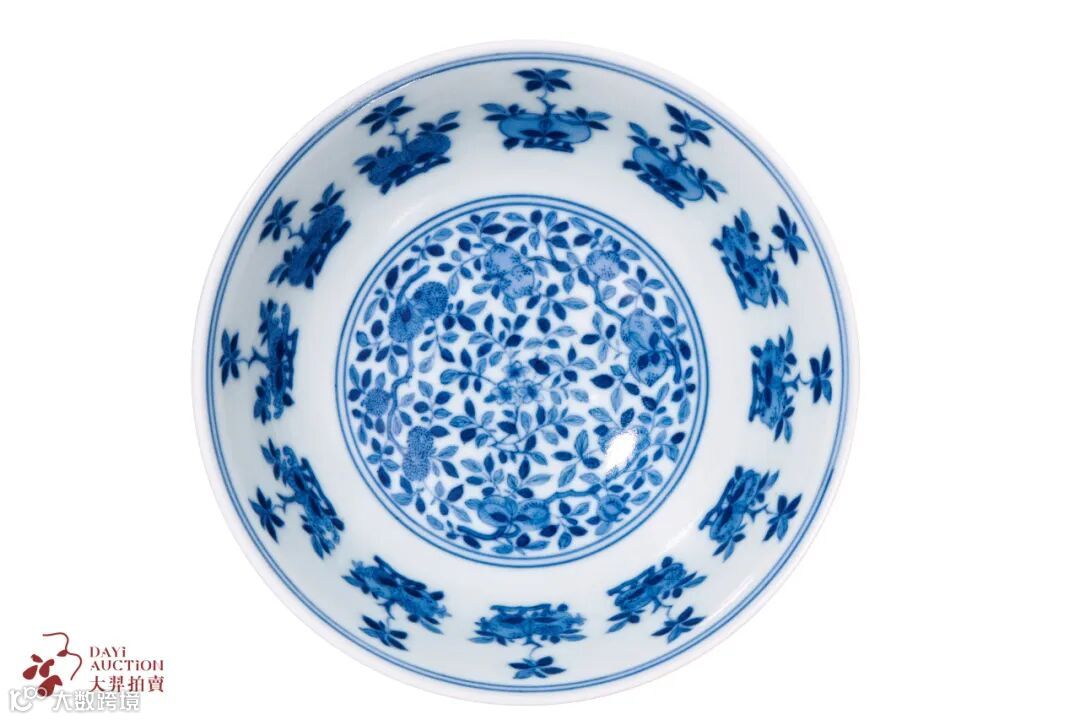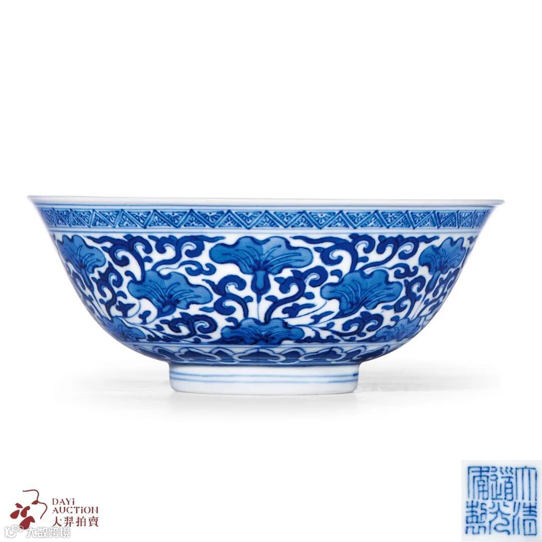 拍品侈口,弧壁,下承圈足,底心青花篆书“大清道光年制”六字三行篆书款。通体内外饰白釉,以青花描绘纹样,内壁自上而下饰几何纹、贯套花卉纹、卷草纹及葫芦形开光花卉纹。外壁口沿饰几何纹,腹部为缠枝苜蓿纹,足胫处如意纹。整器造型规整,纹饰绘制清晰,布局井然有序,青花发色悦目,为道光时期的青花佳作。