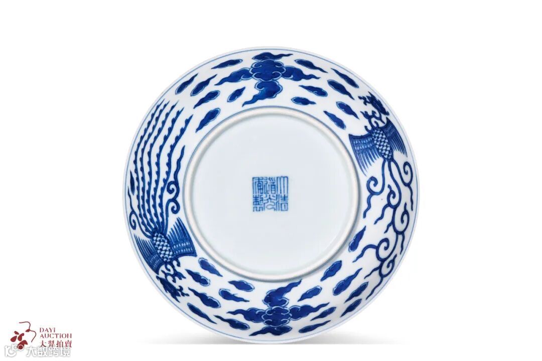 外壁口沿二圈青花纹,足上饰双线青花纹,外壁饰一对凤凰如意云纹,以十字云分隔。宫廷以凤为皇后的图腾,此对凤盘工整有序,象征皇后德洽六宫。