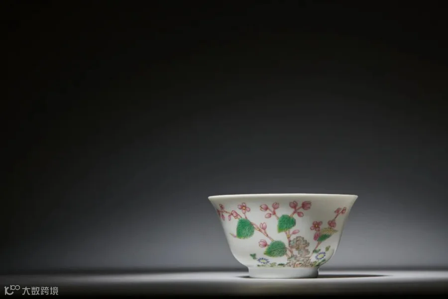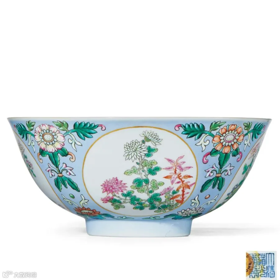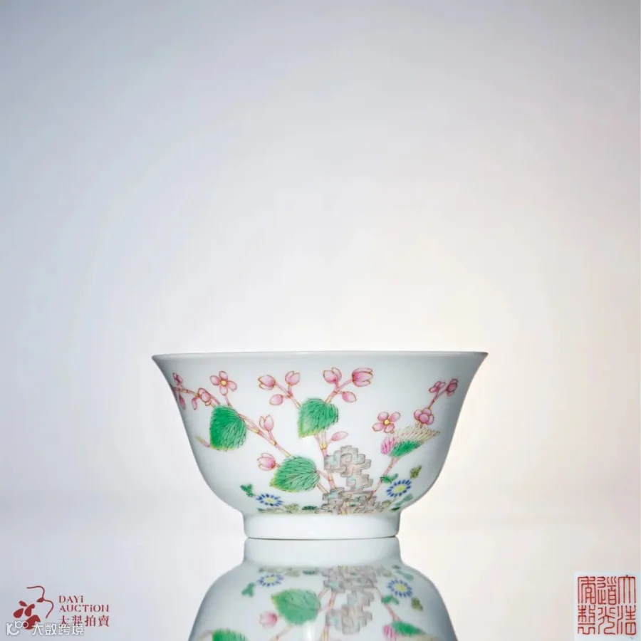 据《清宫瓷器档案》记载,乾隆八年十二月初九日,太监胡世杰交御用青花膳碗一件,传旨:“外面俱烧五彩各色地杖,花样各按时令分别吉祥花样。碗内仍照外面花样,俱要青花白地……五彩要各色地仗,每十件地仗要一色,按节每样先烧造十件。钦此。”从清宫档案可知,此类膳碗共有八种纹样,其创烧与皇帝的直接旨意有关,是由皇帝参与设计或定稿的御用传办瓷器。拍品敷色妍雅艳丽,为道光彩瓷精品之作。