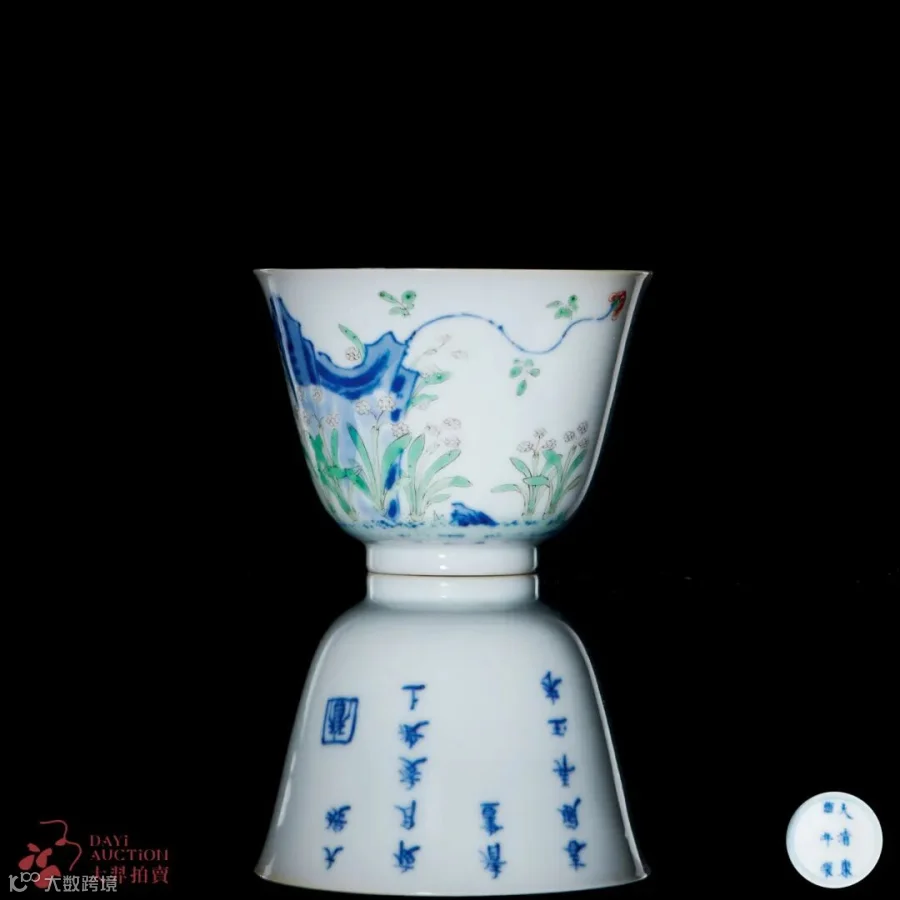 此件拍胎质洁白致密,釉色莹润透亮,形制巧妙,融古汇今,为康熙御窑制瓷的代表之作。康熙花神杯是清代官窑瓷器史上首次将诗词、绘画、书法、篆刻结合于一件器物之上的瓷器品种,其为之后的雍正、乾隆两朝珐琅彩瓷绘艺术奠定了基础。水仙杯为十二月花神杯之首,所绘水仙花神图案,为十二月之代表。外壁以青花五彩绘水仙寿石图,另面青花楷书“春风弄玉来清书,夜月凌波上大堤”诗句后绘“赏”字篆书款。